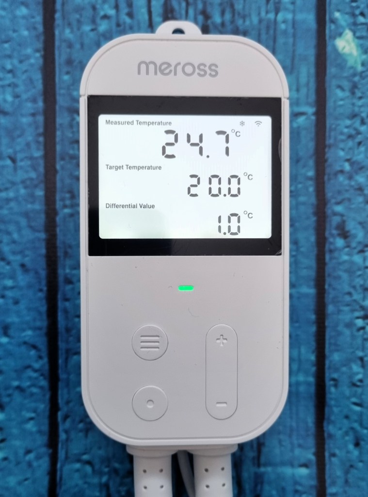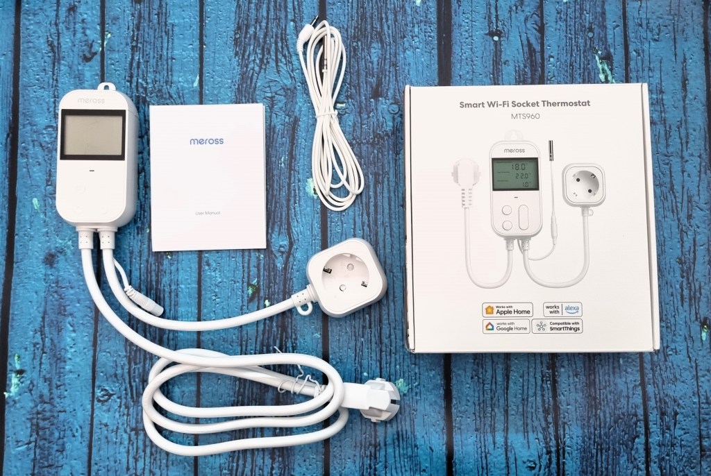 Meross Smart Wi-Fi Socket Thermostat, model MTS960 (EU) to termostat gniazdkowy, posiadający trzy tryby pracy: ogrzewanie, chłodzenie i czasowy. Zakres kontrolowanej temperatury to -30 ~ 110 oC, producent nie podał dokładności. Termostat komunikuje się za pomocą protokołu Wi-Fi (IEEE 802.11 b/g/n, 2.4GHz), więc nie jest bezpośrednio połączona z centralą, lecz poprzez serwer. Urządzenie zasilane jest 100-240 V~, 50/60 Hz, na wyjściu możemy podłączyć urządzenie maksymalnie 16 A. Wymiary urządzenia to: 12 cm x 6 cm x 3,5 cm (bez przewodów). Długości kabli: długość wtyczki 150 cm, długość kabla do gniazda 25 cm, długość kabla na czujnik temperatury 200 cm. Termostat może pracować w temperaturze 0°C ~ 40 °C, wilgotność robocza: 10% ~ 90% bez kondensacji. Sensor zdobył certyfikaty: CE, RoHS, WEEE, UKCA, FCC i ETL.