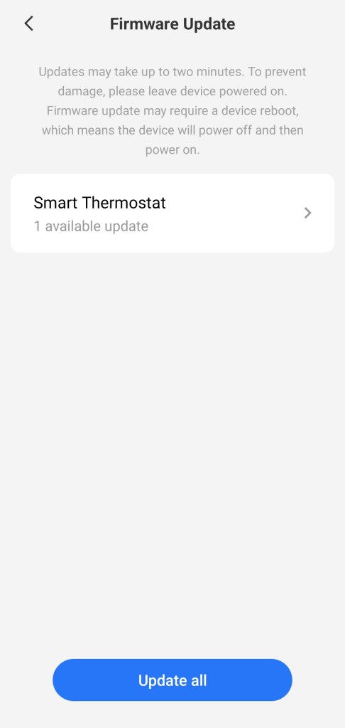 Na początku podłączamy czujnik Meross do zasilania. Zanim przejdziemy do instalowania sensora musimy pobrać aplikację Meross z Google Store bądź AppStore, musimy posiadać smartfon z systemem Android 6 lub nowszym, iOS 13 lub nowszym. Po zainstalowaniu aplikacji możemy przejść do dodania urządzenia w aplikacji Meross. Przy pierwszym uruchomieniu zostaniemy poproszeniu o utworzenie konta. Całość tego procesu zamieściliśmy w odrębnym wpisie. Przechodzimy do dodania urządzenia, klikamy w górnym prawym rogu plusa ( + ). Z listy odnajdujemy kategorie produktu Smart Thermostat, następnie wybieramy model MTS960. Podłączamy do termostatu czujnik temperatury, a następnie całe urządzenie do zasilania. Po czym klikamy Next, upewniamy się, że świeci się ikona Wi-Fi na urządzeniu i klikamy Next. Musimy teraz połączyć się z siecią Wi-Fi. Zostaniemy przeniesieni do ustawień Wi-Fi w telefonie i wybieramy prywatną sieć Wi-Fi. Proszę pamiętać, że musi ona być w paśmie 2,4 GHz. Jeśli smartfon automatycznie nie wykryje termostatu Meross, musimy go samodzielnie wybrać z listy sieci Wi-Fi, klikając Manually connect to device Wi-Fi, wybieramy z listy Meross_TH_XXXX. Nadajemy dowolną nazwę urządzeniu, klikamy Next. W kolejnym oknie wybieramy identyfikator sieć Wi-Fi i wpisujemy hasło. Po chwili nastąpi połączenie z routerem, klikamy Next. Następnie zatwierdzamy, stukając Done. Po instalacji może być koniczna aktualizacja oprogramowania. Klikamy OK, jeśli pojawi się monit, następnie w oknie Firmware Update, wybierz Update all. Urządzenie pojawiło się na ekranie głównym aplikacji Meross.