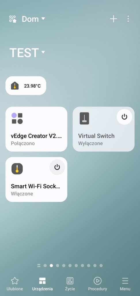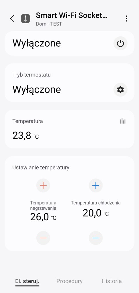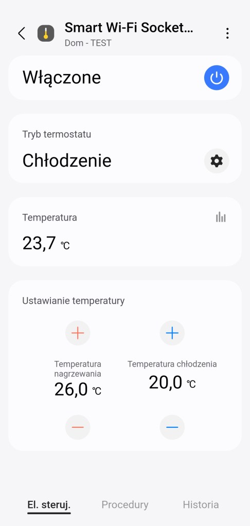 W głównym panelu sterowania urządzeniem na samej górze możliwość włączenia i wyłączenia termostatu. Poniżej znajduje się obecny tryb pracy urządzenia, są to: wyłączony, nagrzewanie i chłodzenie. Dalej znajduje się informacja o aktualnie zmierzonej wartości z czujnika temperatury. Mamy możliwość rozwinięcia tej informacji w wykres i sprawdzenie jak zmieniała się ona w czasie. Na końcu znajdują się opcje ustawienia docelowej temperatury nagrzewania lub chłodzenia. Na dole znajdziemy sekcję „Procedury” mamy tutaj listę automatyzacji, w których używane jest urządzenie. Panel „Historii” nie różni się znacznie od innych urządzeń, mamy dostęp do sortowania i przestudiowania historii działań termostatu. W ustawieniach „Edytuj” mamy oczywiście możliwość zmiany nazwy oraz przypisanego pokoju.
