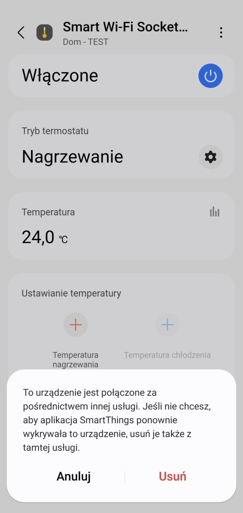 Aby usunąć termostat Meross z ekosystemu SmartThings, należy wejść w główny ekran urządzenia. Kliknąć Więcej opcji ( ⋮ ) w prawym górnym rogu ekranu, a następnie Usuń urządzenie. Następnie potwierdzamy operację, stukając Usuń. Pamiętaj, że usunięcie z aplikacji skutkuje również wyczyszczeniem urządzenia z wszelkich przypisanych procedur i scenerii. Należy pamiętać, aby również usunąć urządzenie Meross z aplikacji producenta, ponieważ zostanie ono wykryte ponownie.
