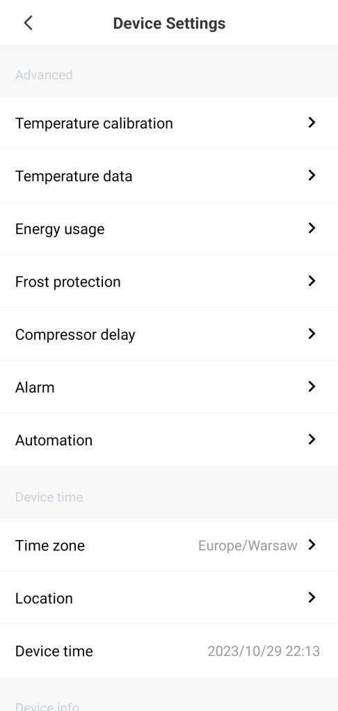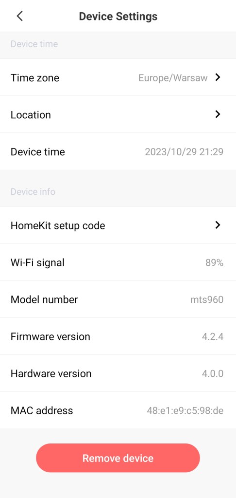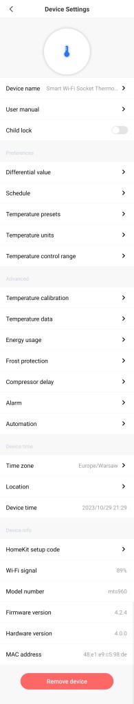 Termostat Meross posiada kilka dodatkowych funkcji, jednak dostępne są one jedynie z poziomu aplikacji mobilnej producenta. Znajdziemy tutaj funkcje kalibracji temperatury, historię odczytów temperatury na osi czasu. Możemy znaleźć informację o zużytej energii elektrycznej przez podłączone urządzenie do termostatu Meross. Kolejną opcją jest ustawienie zabezpieczenia przed zamarzaniem, wartość temperatury minimalnej. Opóźnienie nastawienia temperatury oraz alarm zbyt wysokiej temperatury.