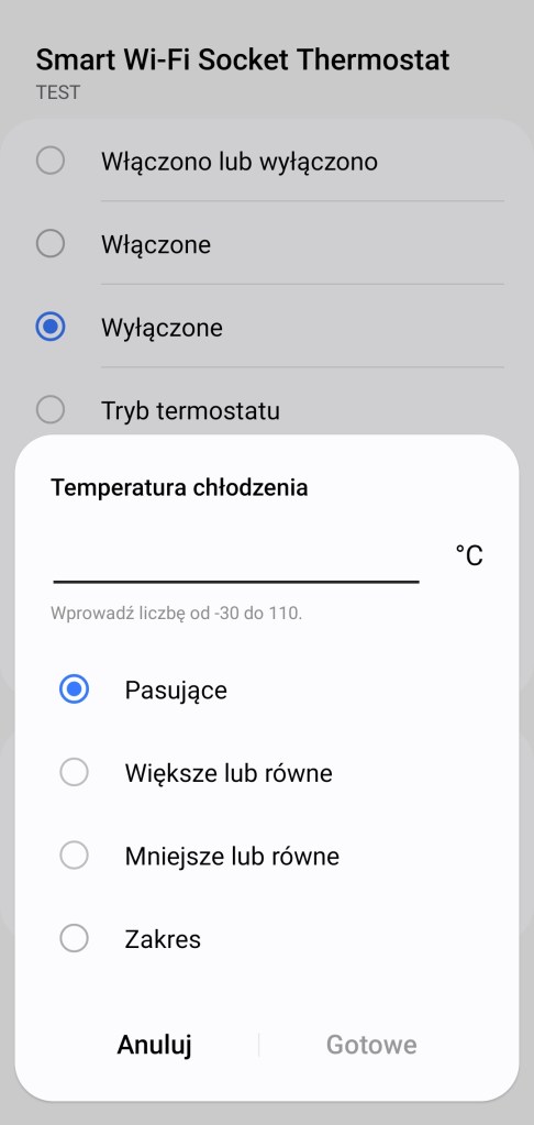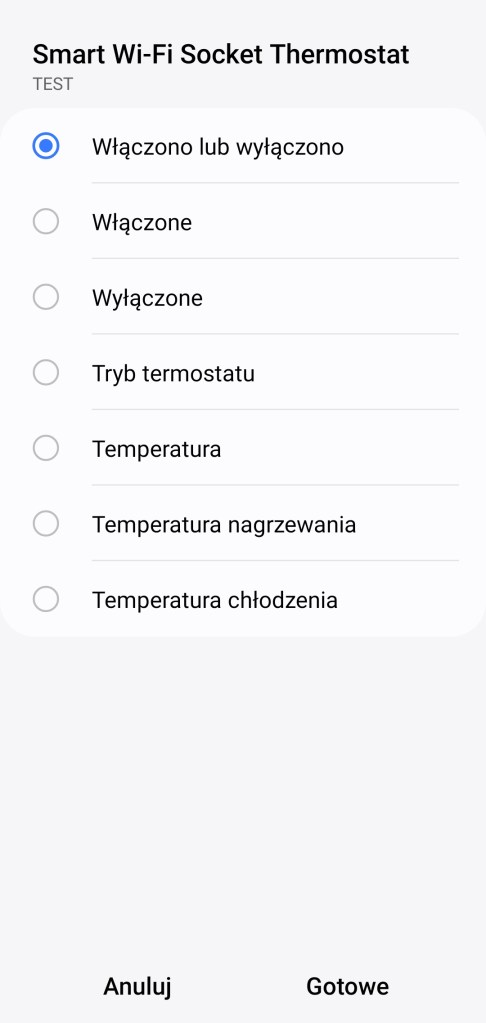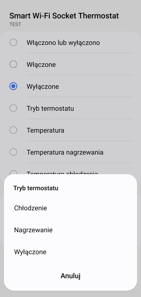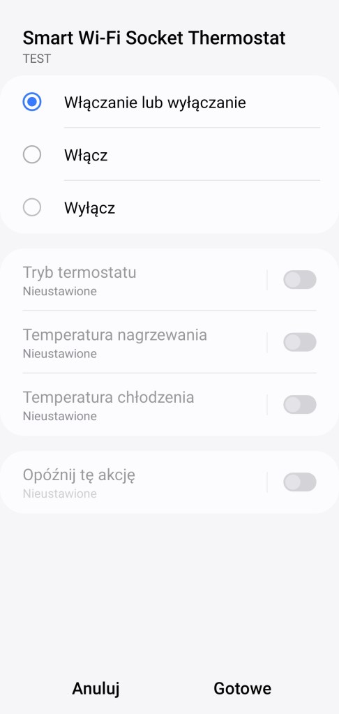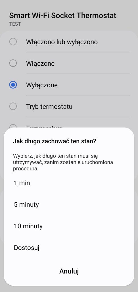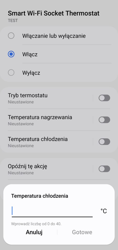 W drugiej możliwości „Wtedy”, mamy ponownie opcje „Włączenie lub wyłączenie” – przypomnijmy czyli zmiana stanu, oraz „Włącz” i „Wyłącz” urządzenie. Kolejno mamy możliwość nastawienia „Trybu termostatu” są to: „chłodzenie”, „nagrzewanie” i „wyłączone”. Następnie mamy opcje ustawienia temperatury nagrzewania i chłodzenia w zakresie 0 – 40°C. Dodatkowo akcję uruchomienia możemy opóźnić o dowolny czas, jak i wyłączyć automatycznie po ustalonym czasie.