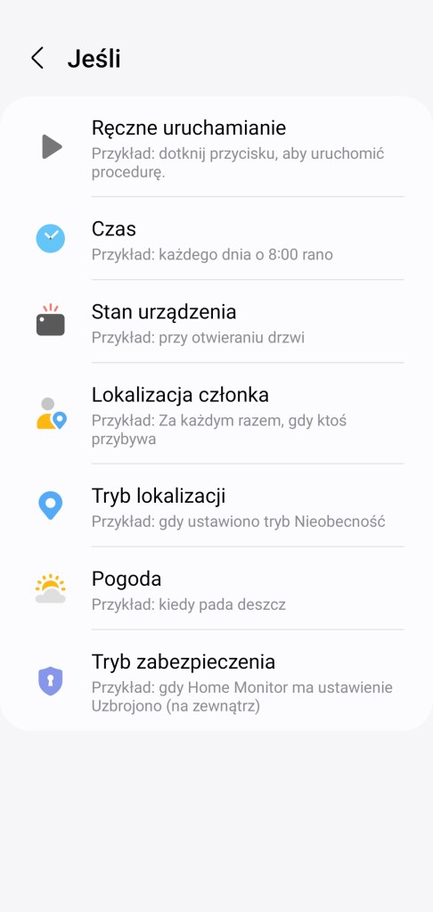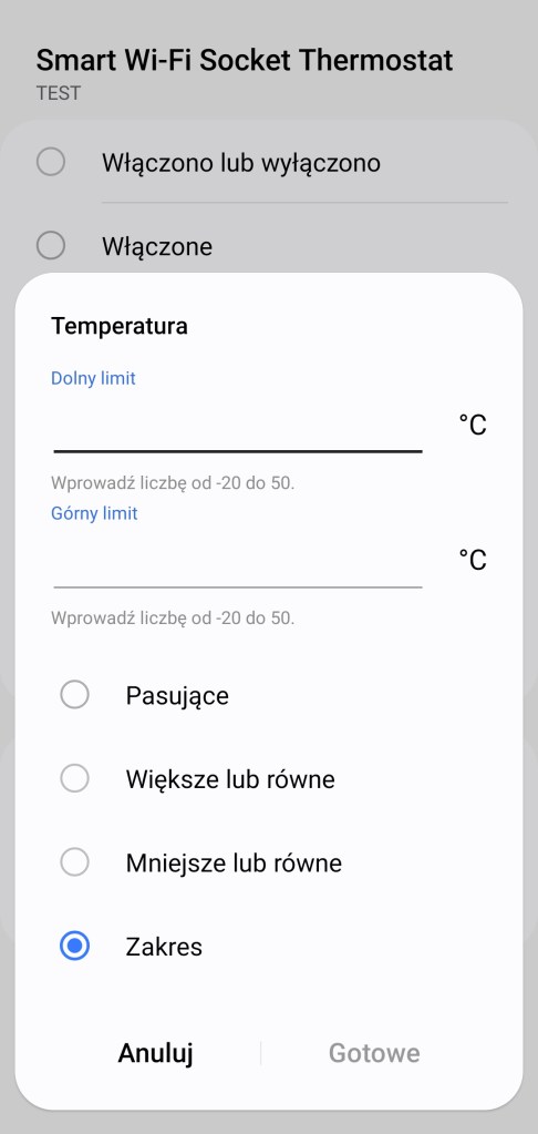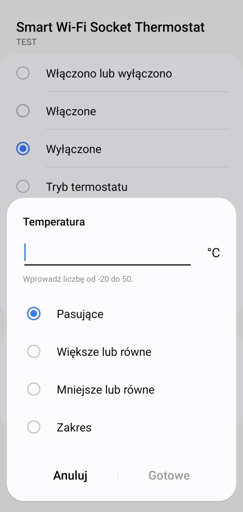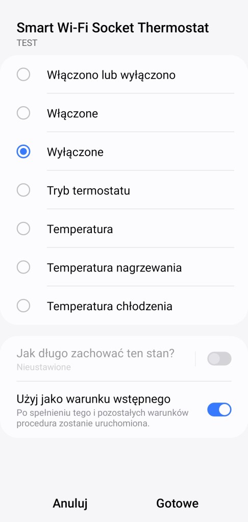 Tworzenie procedur (dawniej automatyzacje) „Jeśli … to Wtedy” musimy podzielić na dwa etapy, ponieważ znacznie różnią się dostępne opcje jeśli inicjujemy warunek „Jeśli” bądź „Wtedy”. W pierwszej możliwości „Jeśli” urządzenie pozwala na wybranie opcji dotyczącej stanu pracu urządzenia: „włączono lub wyłączono”, „włączone” lub „wyłączone”. Dalej mamy „Tryb termostatu”, który możemy ustawić na „chłodzenie”, „nagrzewanie” lub „wyłączone”. Kolejną opcją jest zmierzona „Temperatura”, czyli powiadomienie o temperaturze z zakresu -20 – 50°C, w tym czy są większa/mniejsza niż odczytana oraz wyznaczony zakres. Przed ostatnią opcją jest ustawiona „Temperatura nagrzewania”, czyli inicjacja automatyzacji, w momencie kiedy jest większa/mniejsza niż ustawiona oraz czy mieści się w wyznaczonym zakresie. Ostatnia opcja dotyczy ustawionej „Temperatura chłodzenia”, czyli inicjacja automatyzacji, w momencie kiedy jest większa/mniejsza oraz czy mieści się w wyznaczonym zakresie. Posiadamy również możliwość ustawienia, jak długo dany stan ma trwać, zanim uruchomiona zostanie procedura i czy ma to być warunek wstępny.