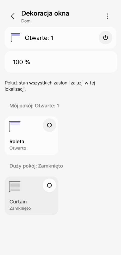 Jeśli wybierzesz oświetlenie, możesz zmienić jasność i kolor. W jednym miejscu możemy sterować wszystkimi roletami.