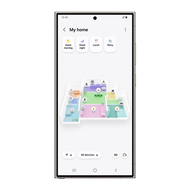 Widok Mapy 3D z ang. 3D Map View usprawnia zarządzanie inteligentnym domem, zamieniając rzeczywiste plany pięter w wirtualne obrazy w aplikacji SmartThings. Użytkownicy mogą wyraźnie zobaczyć swoje urządzenia. Sprawdzić, czy działają i z łatwością regulować oświetlenie, temperaturę, jakość powietrza i zużycie energii w dowolnym miejscu i czasie.