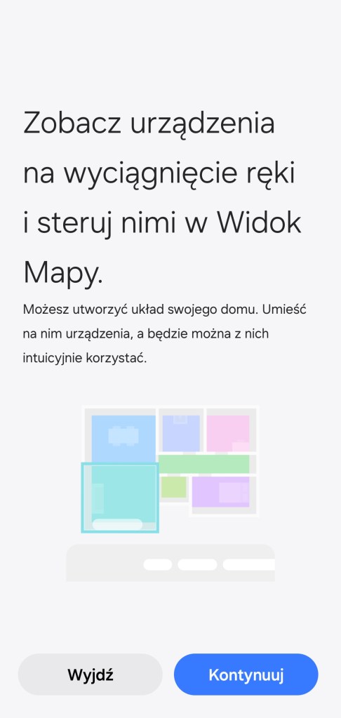 Aby móc stworzyć wirtualny odpowiednik naszego inteligentnego domu SmartThings, musimy posiadać najnowszą aktualizację aplikacji mobilnej oraz spełnić wymagania sprzętowe[2]. Na ekranie głównym „Ulubione” znajdziesz ikonę „Dom” w prawym górnym rogu ekranu. Pojawi się wstęp oraz możliwość utworzenia kondygnacji pomieszczeń. Możemy to zrobić na jeden z trzech sposobów: