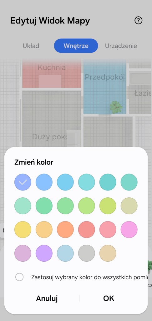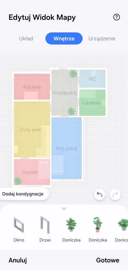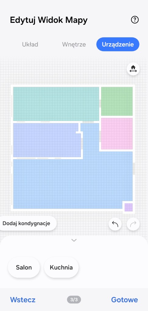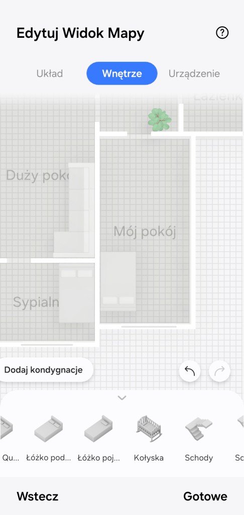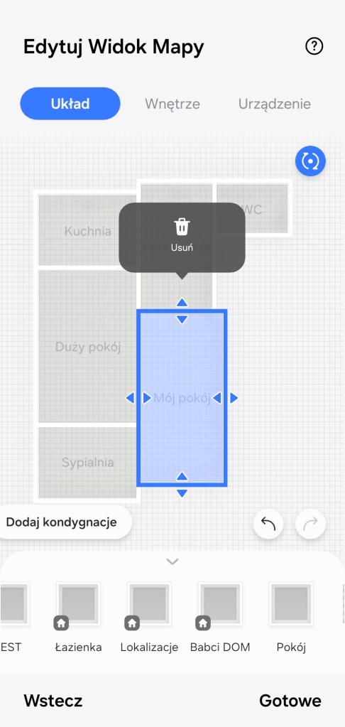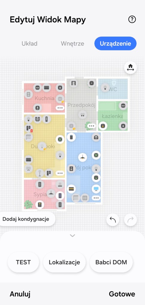 Tworzenie kondygnacji rozpoczynamy od ułożenia struktury pomieszczeń, tak aby odzwierciedlała układ mieszkania — w sekcji Układ. Poniżej mamy dostępne nazwy pokoi utworzonych już w aplikacji. Następnie mamy możliwość umieścić dodatkowe elementy, takie jak: ściana czy rozdzielenie pomieszczeń. Można zbudować kilka kondygnacji. Na mapie nie musimy umieszczać wszystkich pokoi. Przykładowo u nas pomieszczenia „Lokalizacje” czy „TEST” – nie zostały ujęte w kondygnacji.