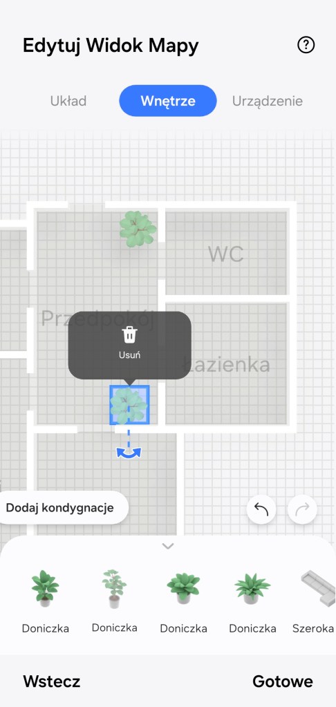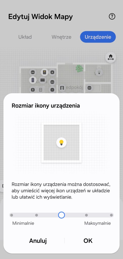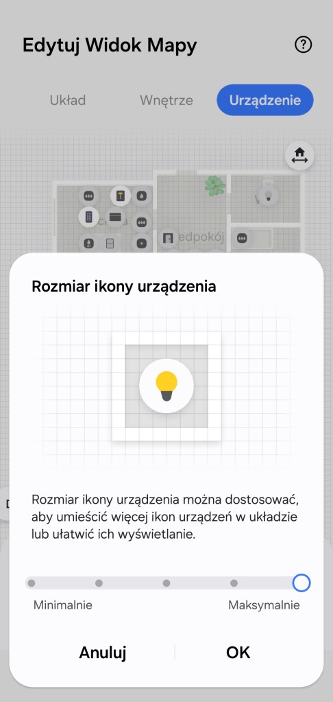 W ostatniej sekcji Urządzenia ustalamy rozmieszczenie urządzeń RTV, AGD i czujników IoT. Ikony urządzeń pojawią się zgodnie z rozmieszczeniem ich po pokojach. Możemy ustalić wielkość ikony w 5-stopniowej skali. Jest opcja ukrycia niepotrzebnych urządzeń, znajdują się one wtedy pod ikoną trzech kropek (…). Wybieramy zbędną ikonę, przytrzymujemy i stukamy Ukryj. Urządzenia możemy rozmieszczać po pokoju (stawiać na środku, przy ścianach czy na szafach/sofach). Kończymy budowę mapy naszego inteligentnego domu, klikając Gotowe, a następnie Zakończ.