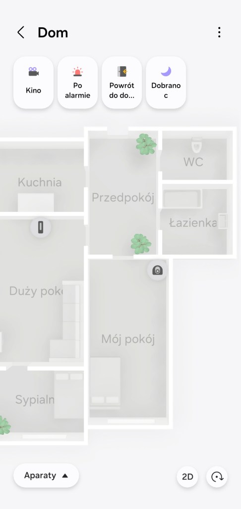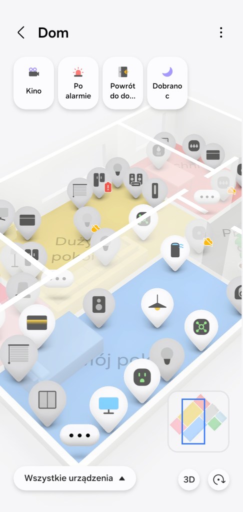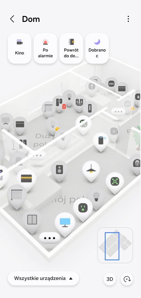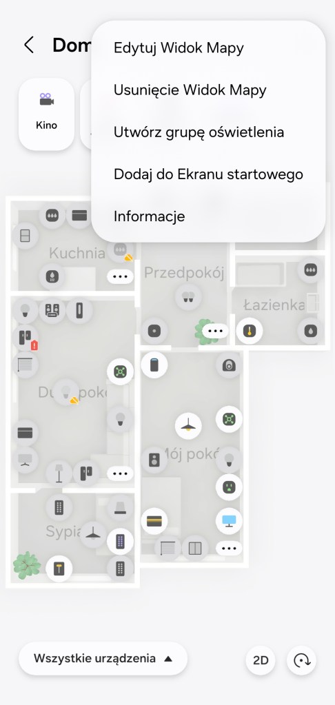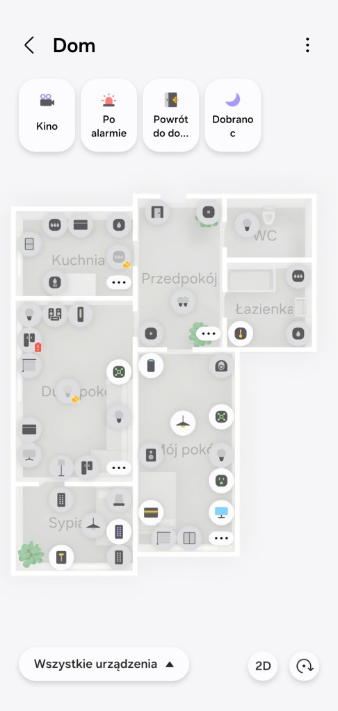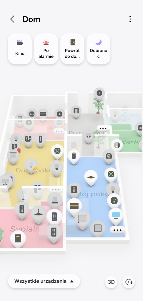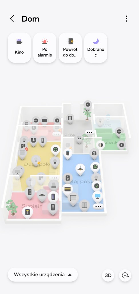 W momencie zakończenia tworzenia mamy możliwość poruszania się po niej. Możemy przybliżać, oddalać czy zmieniać widok z 2D na 3D. Funkcja Widok Mapy 3D pozwala na uruchamianie scen z górnego paska, znajdują się w nim tylko te przypięte do paska „Ulubionych”. Przy ikonach urządzeń możesz naleźć dodatkowe oznaczenie informujące o stanie offline czy o małej pojemności baterii sensora.