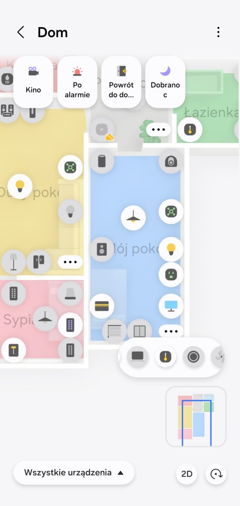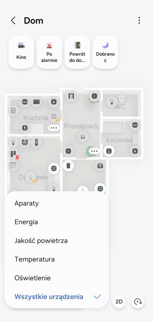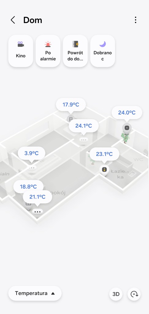 Widok mapy jest również podzielony na: wszystkie urządzenia, oświetlenie, temperatura, jakość powietrza, energia czy aparat (czyt. kamera Aeotec Cam 360). Każdy z tych widoków w przejrzysty sposób ukazuje dane i symuluje ich oddziaływanie np. oświetlony pokój. Po kliknięciu ikony urządzenia mamy np. opcje włączenia czy wyłączenia np. żyrandola, a w roletach np. od IKEI mamy otwórz i zamknij. Jeśli wybierzemy dany pokój, pojawia nam się posumowanie stanu urządzeń, jak w karta stanu.