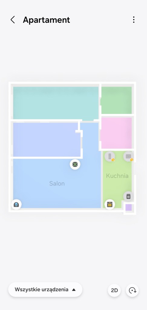 Stworzoną mapę możemy oglądać w aplikacji mobilnej, na ekranie telewizorów Samsung SmartTV oraz ekranach Family Hub w lodówkach Samsunga. Szczegóły w ostatnim rozdziale. Poniżej kilka screenów i perspektyw na zbudowany wirtualny dom SmartThings.