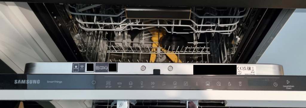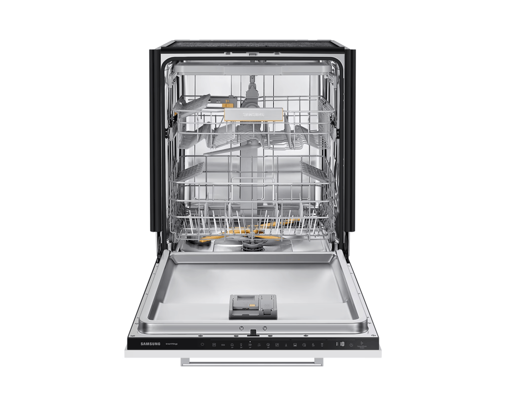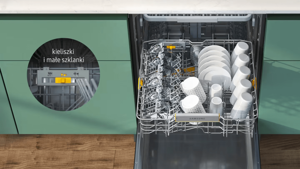 Zmywarka Samsung o numerze seryjnym DW60BG750B00ET to model przeznaczony do całkowitej zabudowy w meblach kuchennych wraz z frontem drzwi. Pasuje do standardowej wnęki 60 cm. Panel sterowania jest ukryty, co oznacza, że po zamknięciu zmywarki nie mamy do niego dostępu. O stanie pracy informuje nas dioda LED pod zmywarką – świecąca w stronę podłogi kuchni. Silnik pompy obiegowej wyposażono w siłę 53W, pompy odpływowej zaś 35W. Moc grzałki maksymalnie 2100W. Do wnętrza urządzenia AGD zmieścimy maksymalnie 14 kompletów naczyń. Możemy ustawić automatyczne otwieranie drzwi uwalniając powstałą podczas zmywania parę – szczelina wynosi 10 cm. Zużycie wody na cykl to 9,2 litrów. Zmywarka posiada 9 cykli zmywania do wyboru, najdłuższy ekologiczny trwa 4h i 15 min. Możemy tworzyć własne programy zmywania. Kilka z nich to: mycie zmywarki, delikatny, ekspresowy, automatyczny czy dezynfekcja, który usuwa bakterie i wirusy. Przykładowo program dotyczący czyszczenia, którego niezbędne jest uruchamianie co 20-22 cykli, dodatkowo zmywarka automatycznie nas o tym fakcie poinformuje. Możemy opóźnić rozpoczęcie zmywania, zdezynfekować naczynia, czy Speed Booster, który skraca długość programu mycia. Kosze górny i dolny zostały wyposażone np. w półki na filiżanki. Zamiast koszyka na sztućce mamy szufladę. Mamy czujnik wycieku, który zabezpiecza nasz dobytek i całą kuchnie przed zalaniem. Nie mamy oświetlenia we wnętrzu urządzenia. Zmywarka została wyposażona w moduł Wi-Fi, który pozwala na sterowanie i zarządzenia urządzeniem z aplikacji SmartThings. Dzięki niej np. kontrolujemy zużycie energii. Szczegółowo o jej funkcjach smart w dalszej części wpisu. Poziom hałasu osiąga 42 dBA, zaś w cyklu cichym 40 dBA. Można to porównać do szumu w pomieszczeniu. Klasa energooszczędności to C. Udało się to osiągnąć dzięki zastosowaniu m.in. funkcji AI Energy Mode. Zużycie energii sięga 75 kWh/100 cykli. Wymiary zmywarki: szerokość 59,5 cm, wysokość 81,5 cm i głębokość 55,2 cm, poniżej umieszczamy zdjęcie wymiarowania. Waga sięga 40,5 kg.