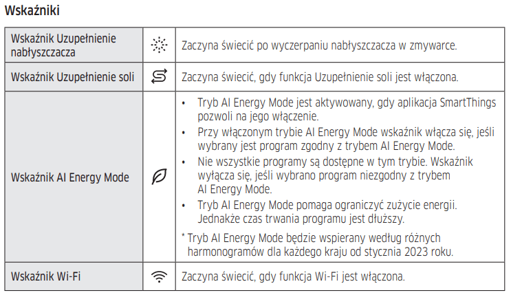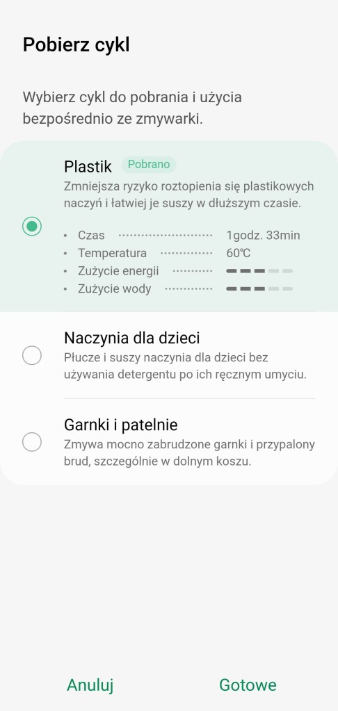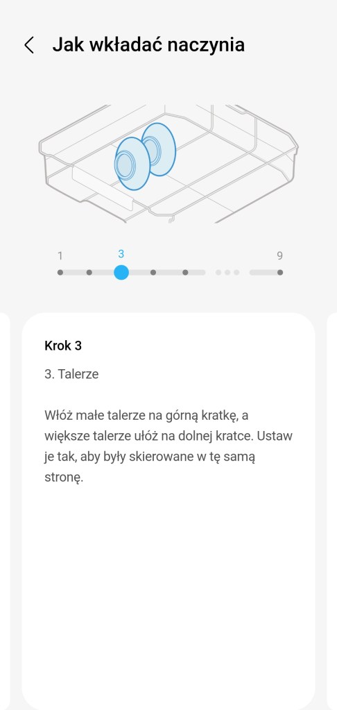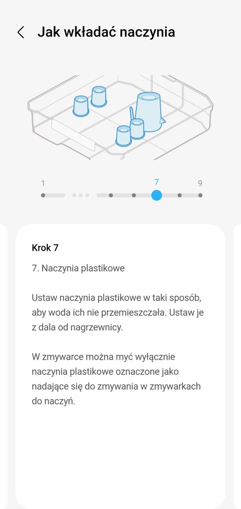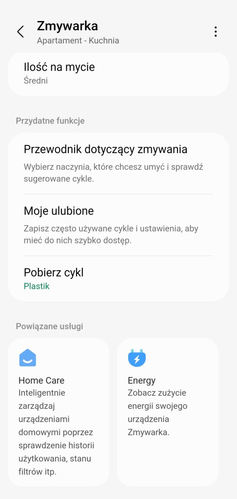 Cykle pracy używane i ich ustawienia możemy zapisać dla późniejszego wykorzystania. Możemy również pobrać nowe cykle dla plastiku, garnków, patelni czy naczyń dla dzieci. Z tym modelem zmywarki Samsung powiązane są dodatkowe dwie usługi SmartThings są to Energy oraz Home Care – opisane zostały poniżej w dedykowanym akapicie.