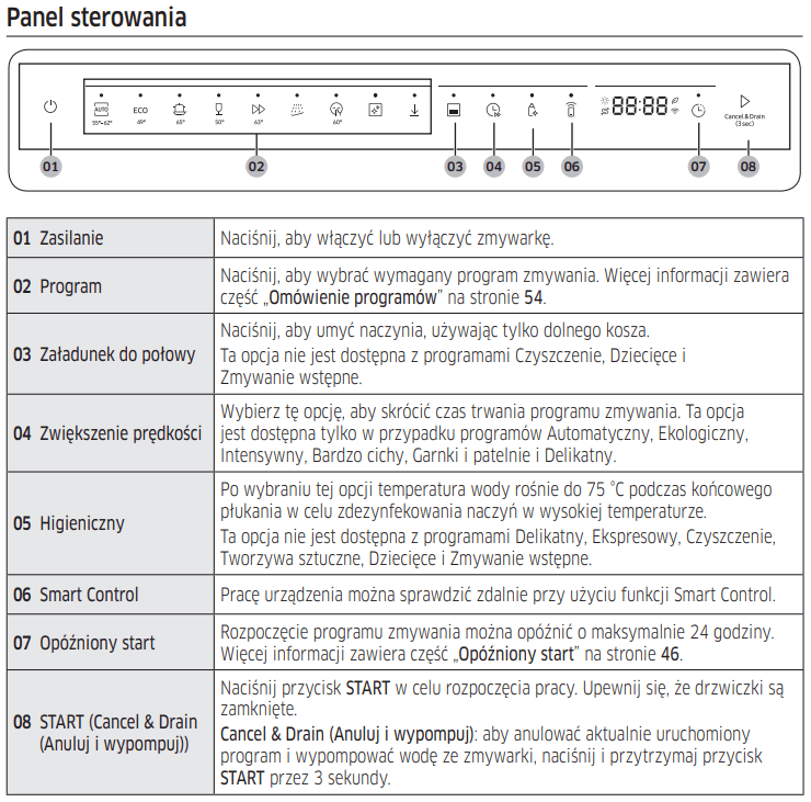 Zmywarka po montażu jest gotowa do użytkowania, aby włączyć urządzenie, należy dotknąć przycisku Zasilania. Następnie możesz wybrać program zmywania, producent zaleca na początu zrobić próbne uruchomienie. Wybierz na wyświetlaczu program Expresowy. Tym samym sprawdzamy prawidłowość montażu oraz czy nie dochodzi do przecieków. Więcej znajdziesz w instrukcji, którą możesz pobrać na dole. Znajdziesz tam też opis poszczególnych programów, jak i funkcji.