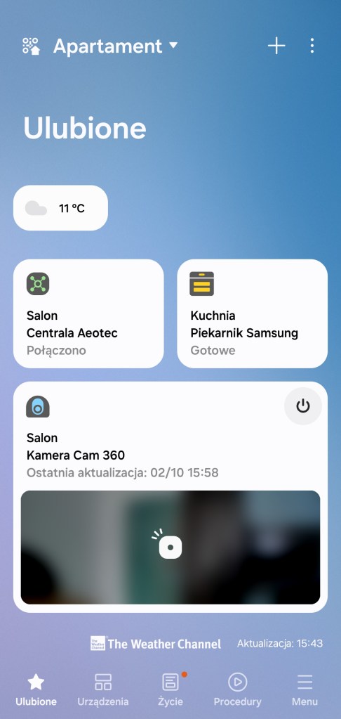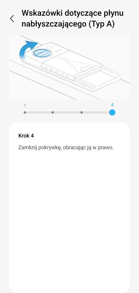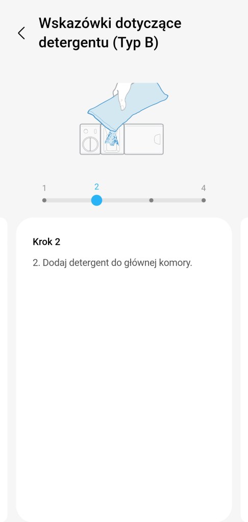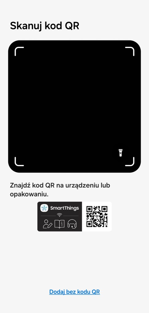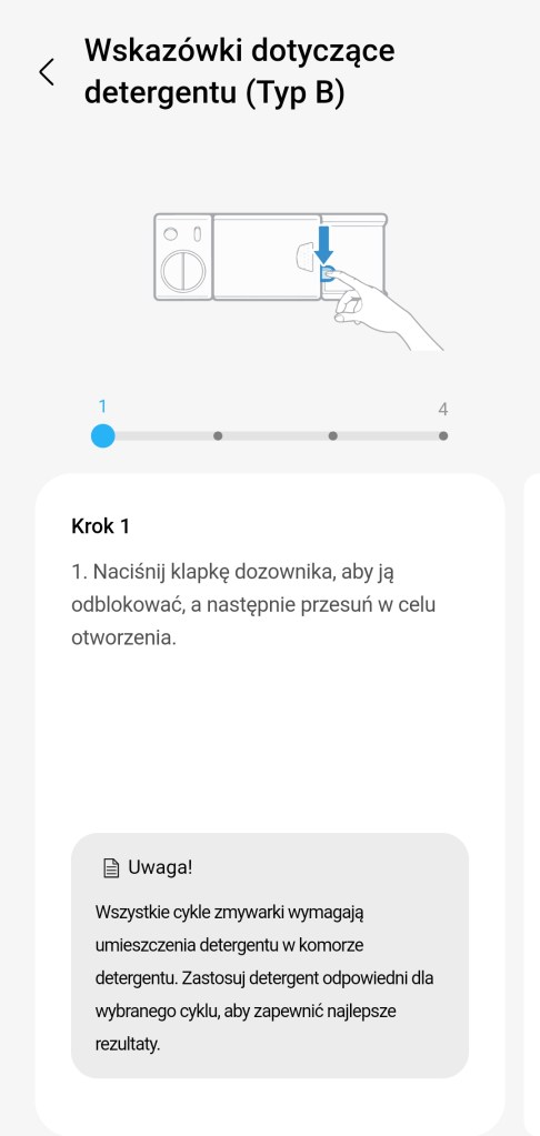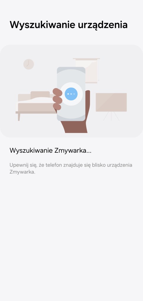 Klikamy przycisk Dodaj ( + ), w prawym górnym rogu ekranu „Ulubionych”, następnie Dodaj urządzenie. Możemy wspomóc się funkcją Skanuj w pobliżu lub wybrać ręczne wyszukanie. Kliknij Dodaj w sekcji Urządzenia Samsung. Z dostępnych typów urządzeń RTV i AGD, kliknij Zmywarka. Teraz należy zeskanować kod QR, powinien znajdować się na górnej części pokrywy po otwarciu zmywarki tuż obok panelu sterowania. Nastąpi szukanie urządzenia, a my musimy włączyć zmywarkę, nacisnąć i przytrzymać przez 3 sekundy przycisk SmartControll do momentu, aż pojawi się AP na wyświetlaczu. Nastąpi wyszukiwanie, po chwili pojawi komunikat czy połączyć z urządzeniem, wybiramy Połącz. Po nawiązaniu połączenia z urządzeniem, trzeba go dodać do własnej sieci Wi-Fi. Z odnalezionych sieci wybieramy naszą sieć Wi-Fi, podajemy hasło. Pamiętaj jednak, że zmywarka obsługuje tylko pasmo Wi-Fi 2,4GHz. Po prawidłowym połączeniu z siecią, nastąpi rejestracja urządzenia na koncie Samsung. Na koniec możemy zmienić nazwę urządzenia AGD. W naszym przypadku zostaliśmy przy klasycznym na „Zmywarka”. Jest możliwość zmiany przypisanej lokalizacji, pokoju lub dodania zmywarki do panelu „Ulubione”. Zatwierdzamy zmiany, wybierając Zapisz. Kończymy proces instalacji, klikając Gotowe. Pobrany zostanie nowy dodatek umożliwiający sterownie zmywarka Samsung, a po chwili ukaże się panel sterowania nowym urządzeniem AGD.