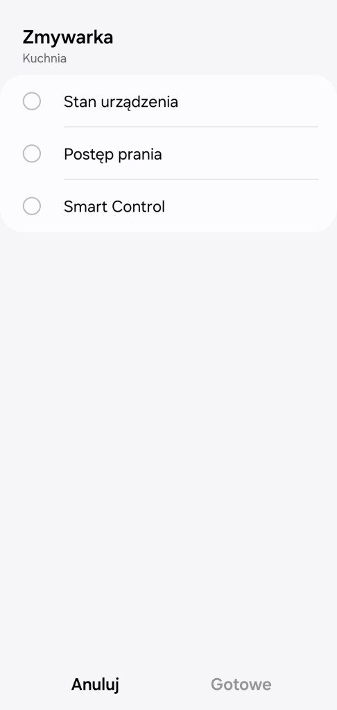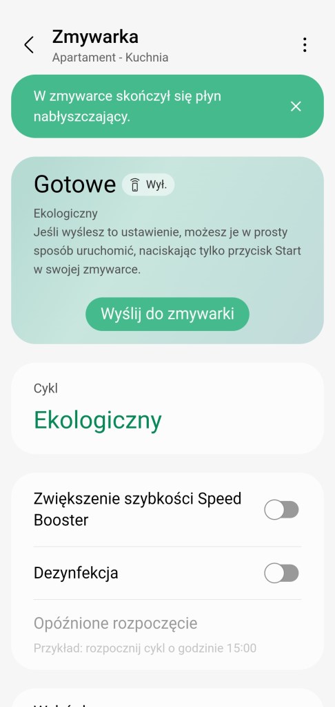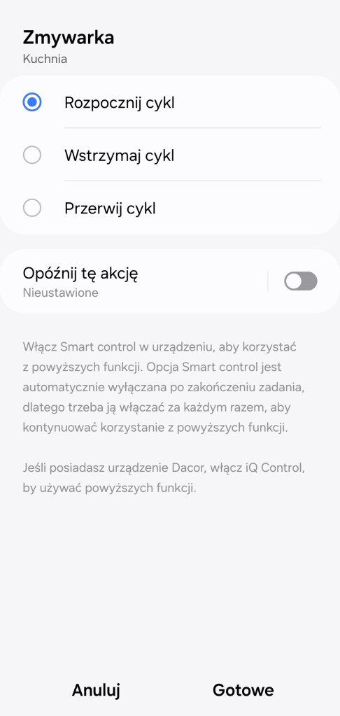 W drugiej możliwości „Wtedy” zmywarka Samsung pozwala na zmianę zarządzanie cyklem czyszczenia naczyń. Możemy wydać polecenie rozpoczęcia, wstrzymania i przerwania pracy. Akcję uruchomienia automatyzacji możemy opóźnić o dowolny czas. Pamiętajmy jednak, że przed musi zostać uruchomiona funkcja Smart Control, czyli zdalnego sterowania. Za każdym razem kiedy uruchamiamy zmywanie.