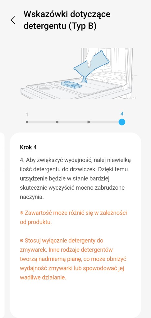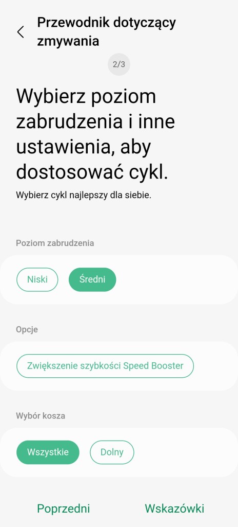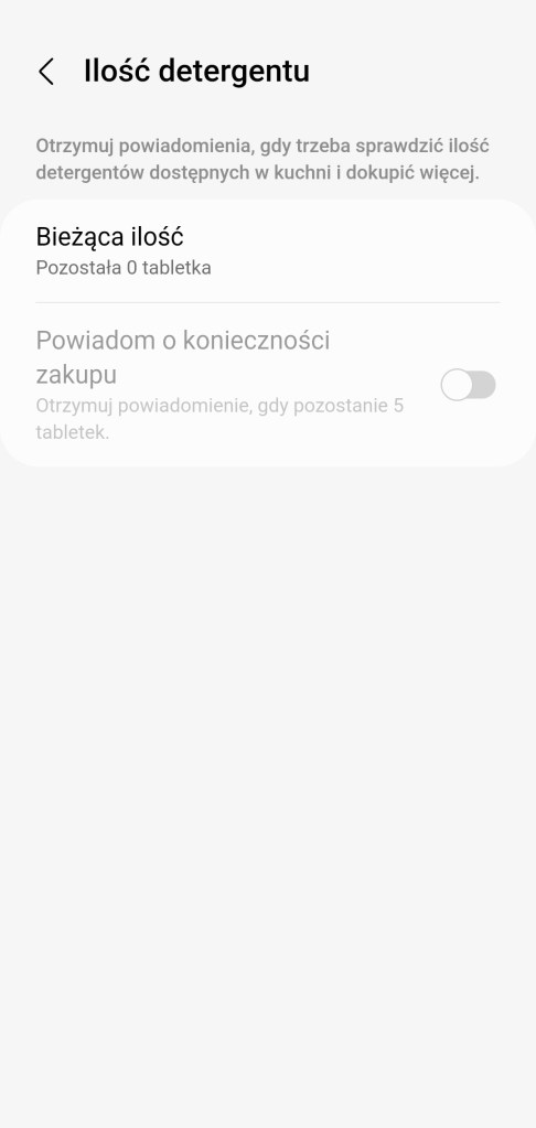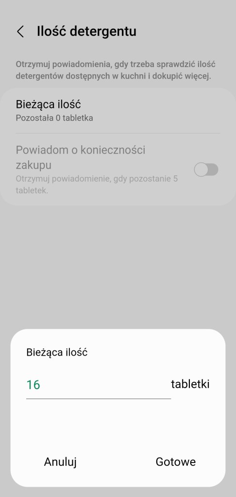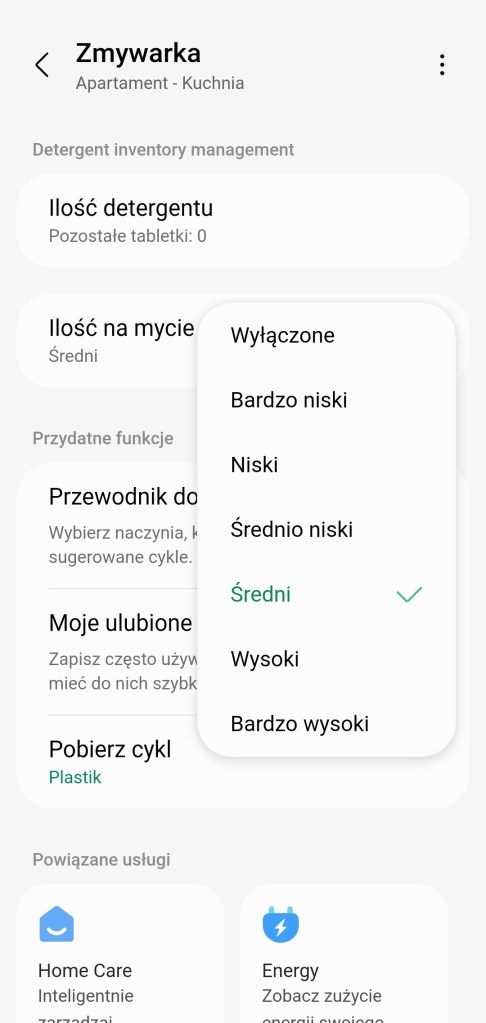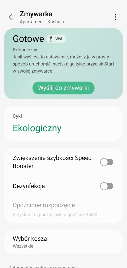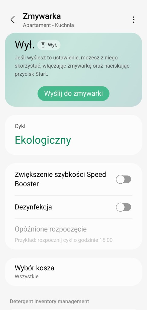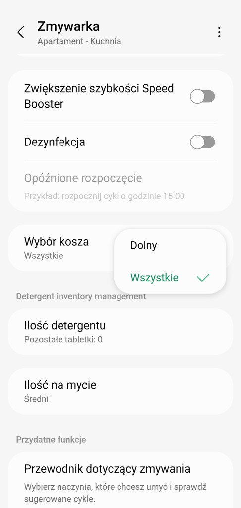 Dalej w panelu strowania możemy określić Wybór kosza ta opcja pozwala ustawić jak bardzo została wypełniona zmywarka naczyniami, być może mamy tylko zapełniony dolny kosz i nie trzeba „myć” górnego co przyczynia się to do oszczędności wody. Dalej w sekcji „Detergent inventory management”możemy ustawić ilość kapsułek, jaką mamy w zapasie. Tym samym możemy otrzymywać powiadomienie, kiedy ilość kapsułek będzie niska i należy je zakupić. Druga opcja to określenie ilości detergentu na jedno mycie od wyłączone po bardzo wysoki.