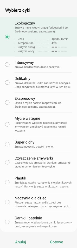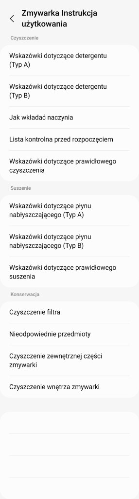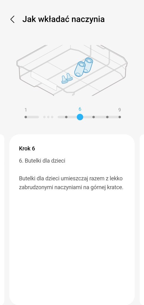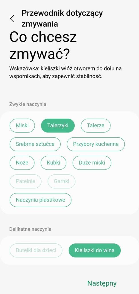 W sekcji „Przydatne funkcje” znajdziemy Przewodnik dotyczący zmywania. Szczególnie przydatny dla osób, które mają pierwszy raz kontakt ze zmywarką. Po odpowiedzi na krótkie pytania: co chcesz zmywać ? wybierz poziom zabrudzenia ? Pojawia się preferowany cykl dla danego typu naczyń, które umieszczono w zmywarce.