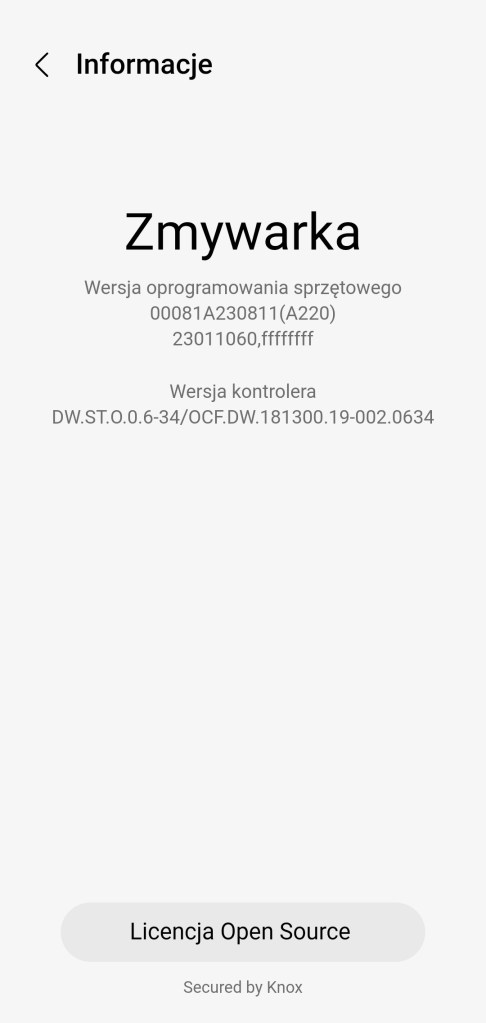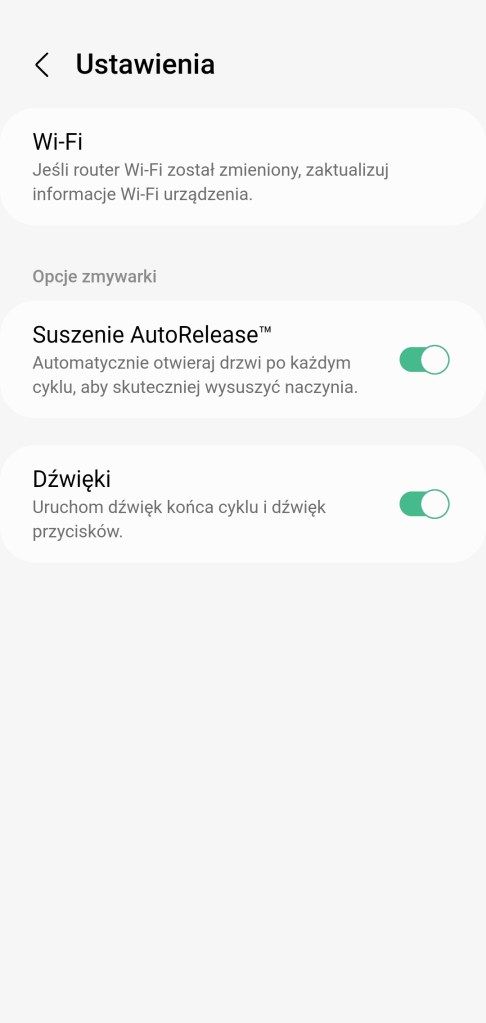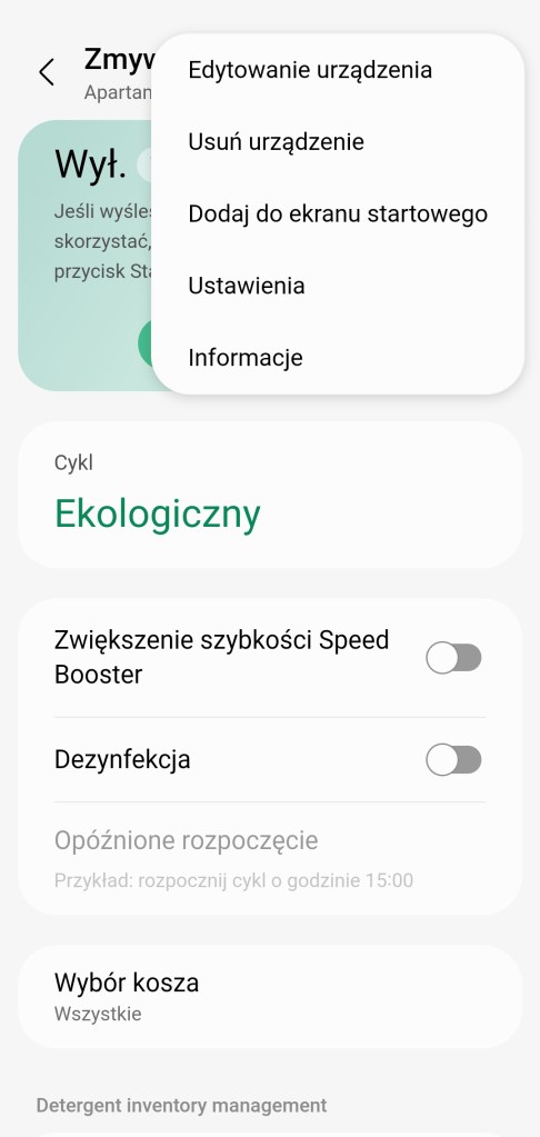 Mamy również Więcej opcji ( ⋮ ) w prawym górnym rogu ekranu. Znajdziemy tutaj: Edytowanie urządzenia – czyli zmianę nazwy, pokoju czy lokalizacji. Następnie możliwość usunięcia zmywarki, dalej jest opcja dodania skrótu do ekranu startowego w Androidzie. Przedostatnia opcja to Ustawienia: możemy zmienić sieć Wi-Fi, zdecydować czy po umyciu naczyń mają się otwierać drzwi zmywarki oraz czy mają być wydawane dźwięki kiedy zakończy się cykl zmywania. Ostatnia możliwość Informacje to podejrzenie wersji kontrolera czy oprogramowania sprzętowego.