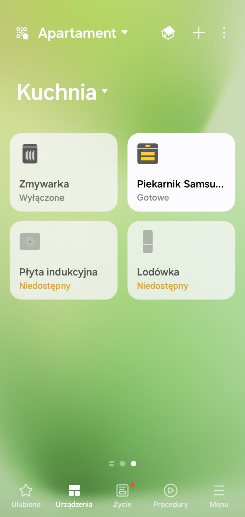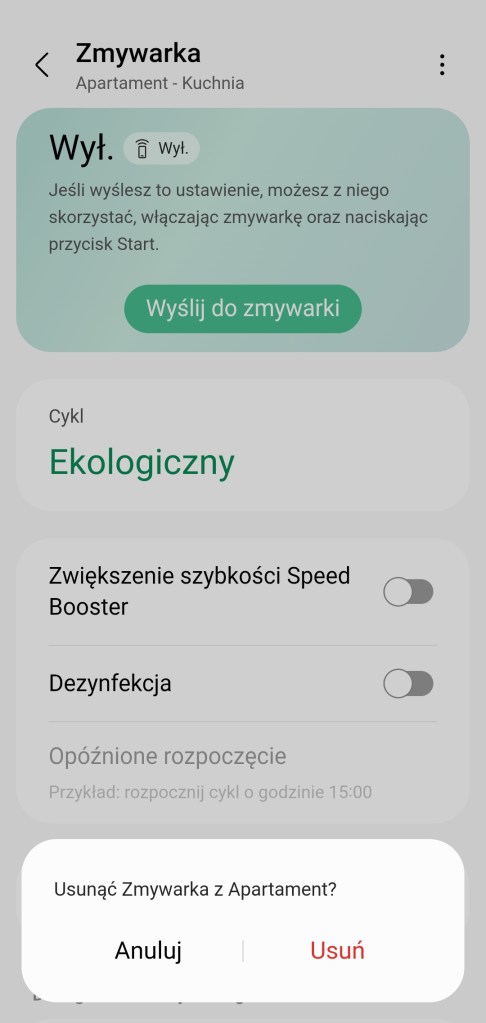 Aby usunąć zmywarkę Samsung, należy wejść do panelu sterowania urządzeniem AGD. Kliknąć Więcej opcji ( ⋮ ) w prawym górnym rogu ekranu, następnie z listy opcji wybrać Usuń urządzenie. Na koniec potwierdzamy operację, stukając Usuń. Po chwili pojawi się komunikat o pozytywnym usunięciu.