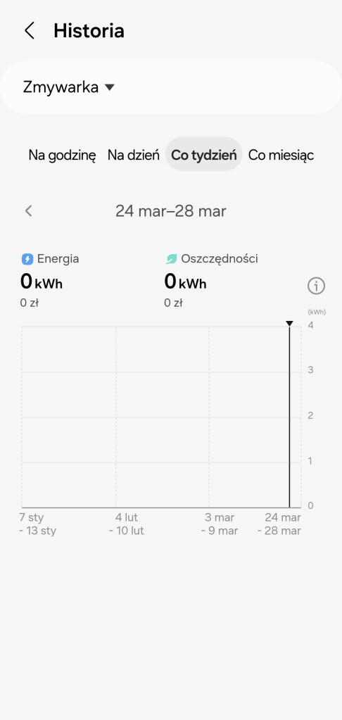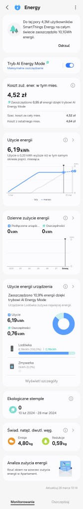 Firma Samsung mocno stawia na oszczędzanie energii, przykładowo poprzez zastosowanie funkcji AI Energy Mode, która dzięki szczucznej inteligencji ma zmniejszyć rachunki za prąd. Prezentowana zmywarka posiada tryb AI Energy Mode, który w znaczący sposób może obniżyć rachunki za prąd i emisję śladu węglowego. Możemy zdecydować czy stawiamy na maksymalne oszczędności, czy natężenie CO2. Dzięki integracji z usługą SmartThings Energy, pozwala na bieżąco śledzić zużycie energii elektrycznej. Otrzymujemy powiadomienia o codziennym zużyciu i ukazuje przejrzyste wykresy. Linie czasu są podzielone na godziny, dni, tygodnie, jak i miesiące. Każde urządzenie można sprawdzić osobno, bądź zbiorczo. Jest możliwość ustawienia miesięcznych limitów zużycia. Mamy również wskazówki, jak zwiększyć oszczędności. Na szczegółowy opis usługi SmartThings Energy zapraszam do tego wpisu.
