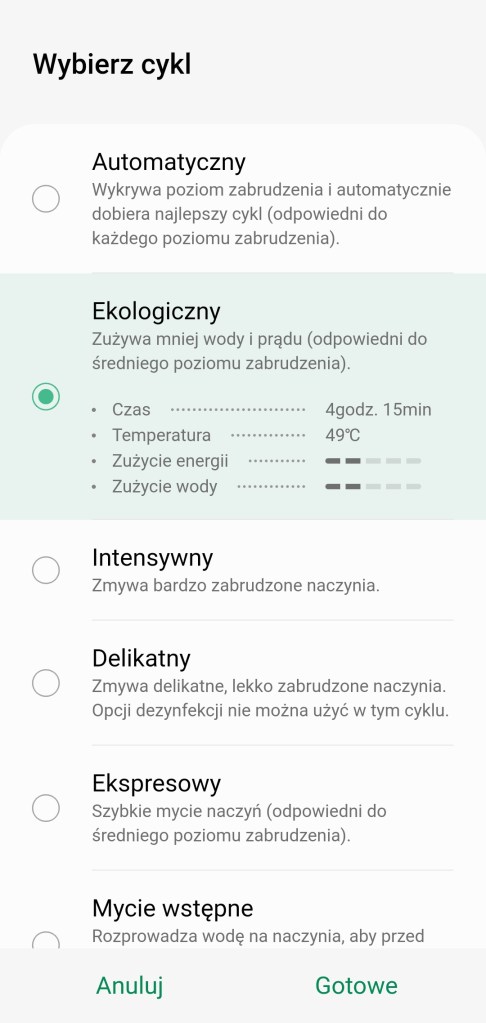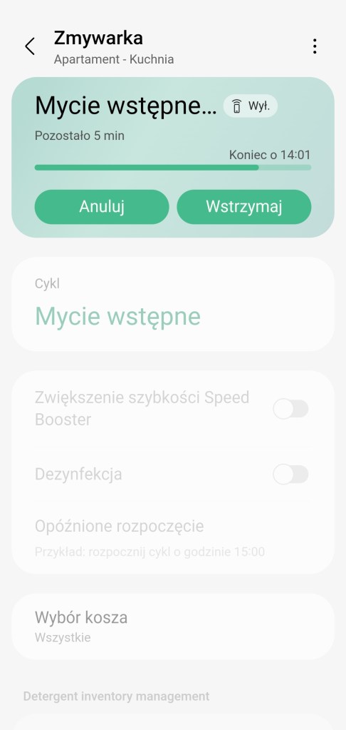 W głównym panelu sterowania urządzeniem mamy informację o stanie stanie pracy zmywarki: czy jest ona gotowa do pracy czy wyłączona, w tym czy wykonuje wybrany cykl oraz jak długo jeszcze potrwa zmywanie. Poniżej w sekcji Cykl możemy wybrać jeden z dziesięcu cyklów mycia naczyń w zależności od potrzeby. Dalej widzimy opcje Speed Booster, czyli zmniejszenia czasu zmywania naczyń w danym cyklu. Dalej możemy zarządać dodatkowo dezynfekcji naczyń. Mamy również opcje opóźnienia rozpoczęcia pracy zmywarki, czyli nastawienia jej godziny startu. Poniżej kilka screenów z informowaniem o cyklu pracy zmywarki. Jak można zauważyć w każdej chwili można wstrzymać pracę.