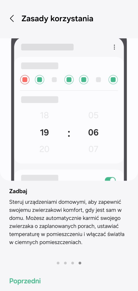 W połowie kwietnia 2024 roku usługa Pet Care otrzymała poprawki istniejących funkcji oraz nowy bardziej przejrzysty wygląd, ułatwiający zarządzanie naszymi pupilami. Po zainstalowaniu aktualizacji Pet pojawiają się zasady korzystania, klikamy Wróć ( < ), aby przejść do nowych funkcji.