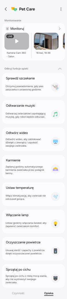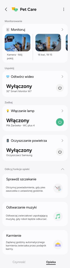 W zakładce Opieka, mamy możliwości skorzystania z procedur monitorowania, uspokajania lub kontroli nad zwierzęciem. Kamery Aeotec Cam360 pozwalają podejrzeć, co robi nasz pupil. Zmieniony interfejs umożliwia łatwe uruchomienie telewizora, aby uspokoić czworonoga. Usługa podpowiada nam automatyzacje, takie jak uruchomienie oczyszczacza powietrza, odtwarzania muzyki czy włączenie oświetlenia. Inteligentny karmnik pozwala zaplanować godziny karmienia.