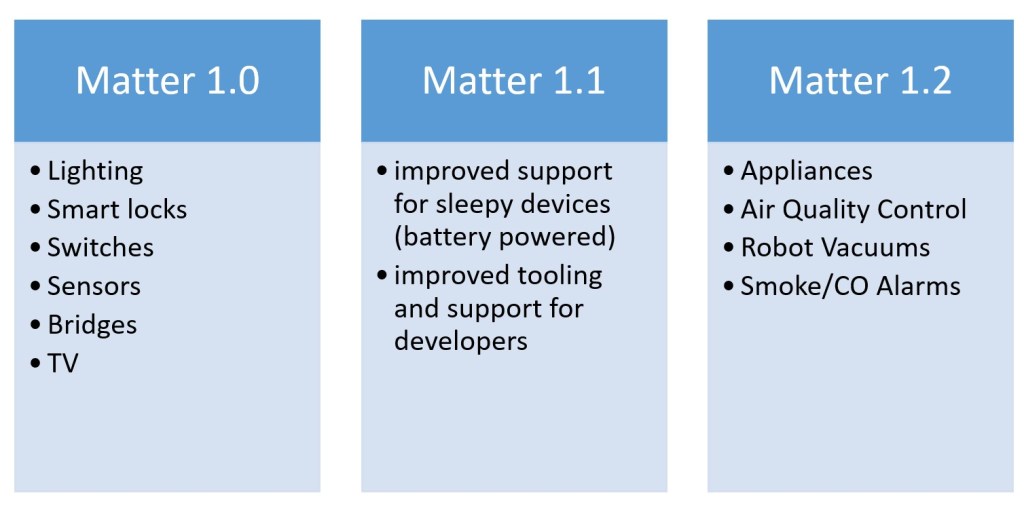 Powyżej lista głównych typów urządzeń Matter, obsługiwanych w kolejnych wersjach standardu.