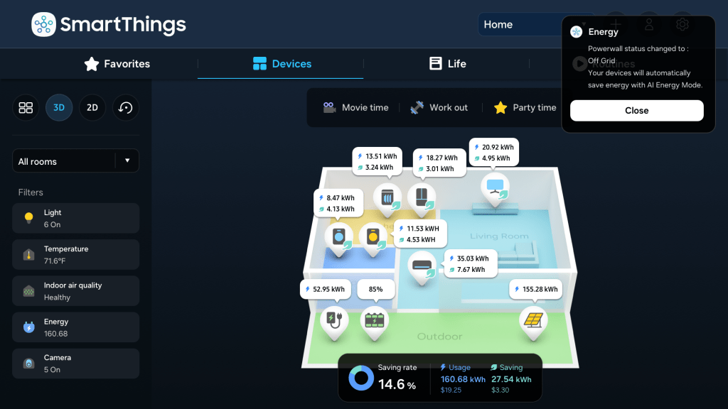 - Powiadomienia Tesla na urządzeniach Samsung dostarczają aktualnych informacji o zużyciu energii w domu, pomagając podejmować mądrzejsze decyzje dotyczące wydłużenia czasu podtrzymywania zasilania, np. wyłączania urządzeń o dużym poborze energii, takich jak zmywarki do naczyń czy suszarki.