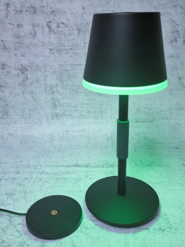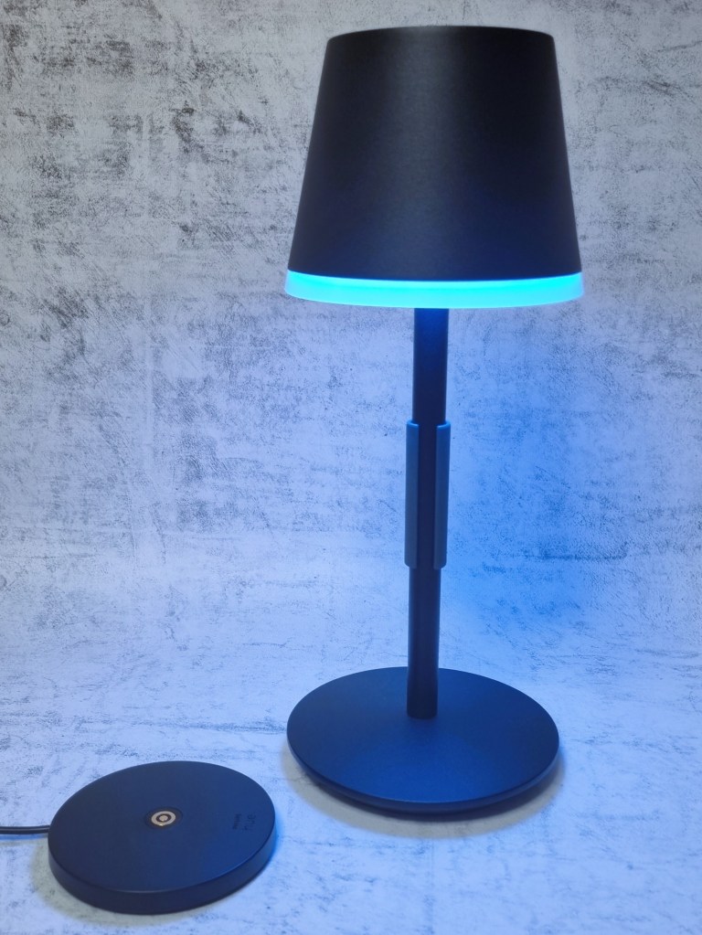 To sprytne urządzenie będące bezprzewodową lampą w klasycznym kształcie oświetlenia stołowego. Zasilane jest przy pomocy kumulatora, który ładujemy za pomocą leżącej na stole podstawki. Naładowany pozwala na kilkanaście godzin świcenia po zdjęciu lampy z ładowarki i używania jej np. w ogrodzie. Możemy uruchomić dowolny kolor światła oraz barwę ciepłą, jak i zimną. Co pozwala stworzyć wyjątkowe aranżacje światlne na potrzeby domowej rozrywki czy wieczornego relaksu.