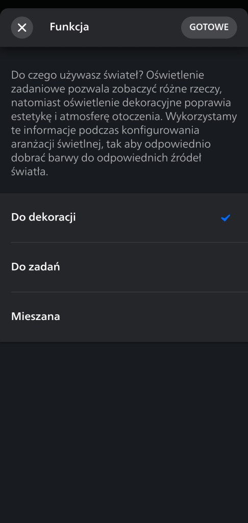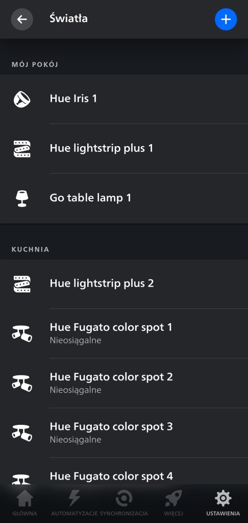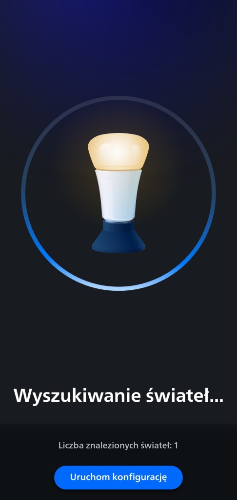 Jeśli posiadamy mostek Hue i centralę SmartThings możemy przejść do tradycyjnej instalacji. W pierwszej kolejności musimy połączyć nową lampę LED z mostkiem i aplikacją Philips Hue. W tym celu musimy pobrać aplikację z Google Store (Android 10 lub nowszy), bądź AppStore (iOS 15.0 lub nowszy). Po zainstalowaniu aplikacji uruchamiamy ją. Aby wyszukać nowe urządzenia, musimy przejść do Ustawienia aplikacji, klikamy w prawym dolny róg ekranu. Z dostępnych opcji, kliknij Światła, następnie plus ( + ) znajdujący się w prawym górnym rogu. Należy upewnić się, że lampa podłączona jest do zasilania. Możemy ją dodać poprzez wpisanie numeru seryjnego (znajduje się on na spodzie lampy) lub poprzez wyszukanie. Wybraliśmy drugą opcję, klikamy Wyszukaj. Po chwili zostanie wykryta, nadajemy jej nazwę lub pozostawiamy domyślną i zatwierdzamy, klikając Zapisz. Następnie umieszczamy w pokoju, w tym celu przeciągamy ją do wybranego. Kończymy proces instalacji, wybierając Gotowe. Na ekranie pojawi się komunikat o prawidłowym dodaniu lampy stołowej GO.
