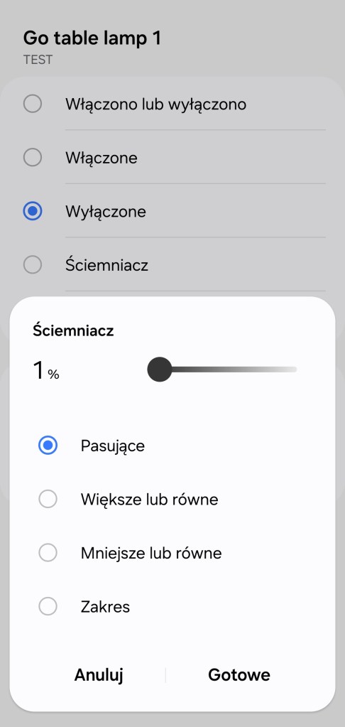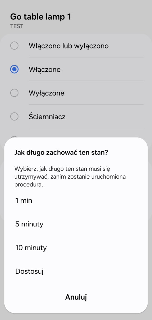 Tworzenie procedur (dawniej automatyzacje) „Jeśli … to Wtedy” musimy podzielić na dwa etapy, ponieważ znacznie różnią się dostępne opcje. W pierwszej możliwości „Jeśli” urządzenie pozwala na wybranie opcji „Włączono lub wyłączono”, czyli zmiana stanu, bądź „Włączone” i „Wyłączone”. Poniżej mamy wartość ściemniacza 1 – 100% i temperatury kolorów z zakresu 2000 – 6500 K. Możemy ustawić również zakres tych wartości. Dodatkowo mamy opcję, jak długo zachowany powinien być stan przed uruchomieniem procedury oraz, czy ma być to warunek wstępny.