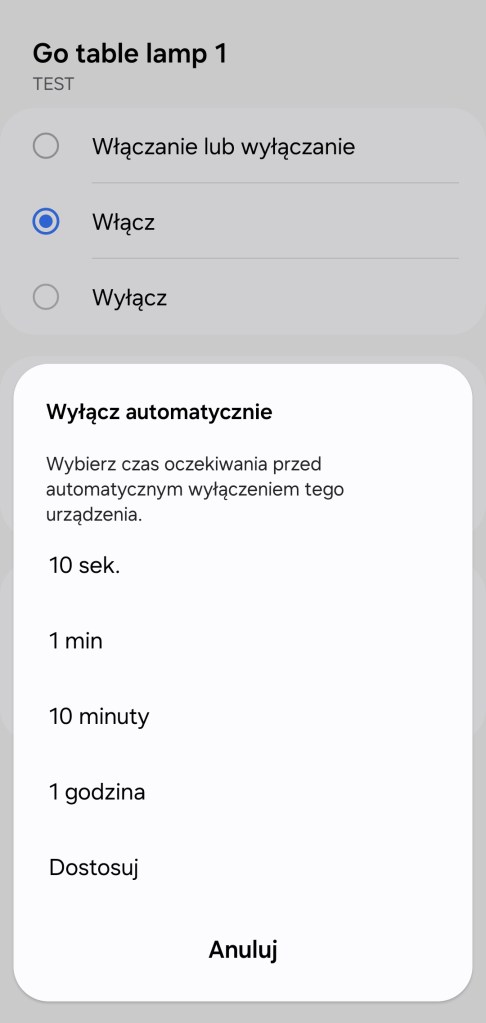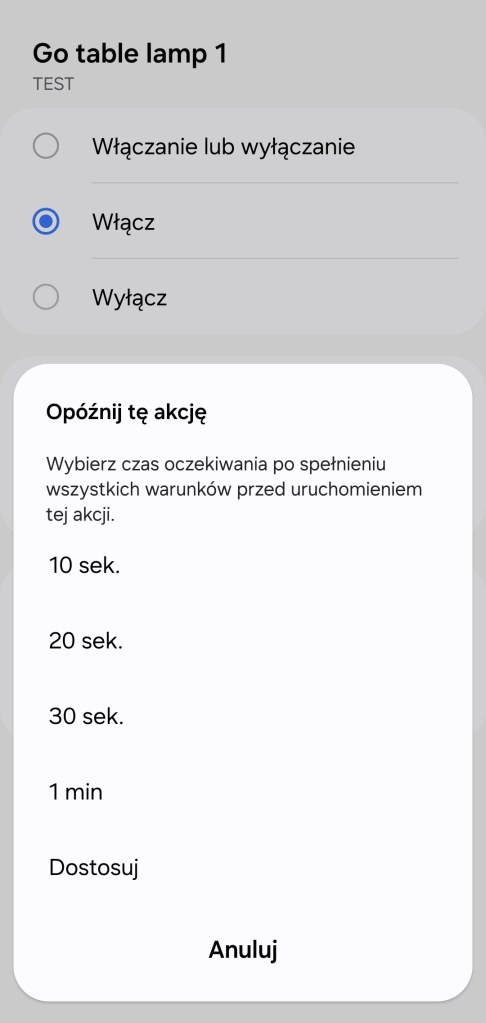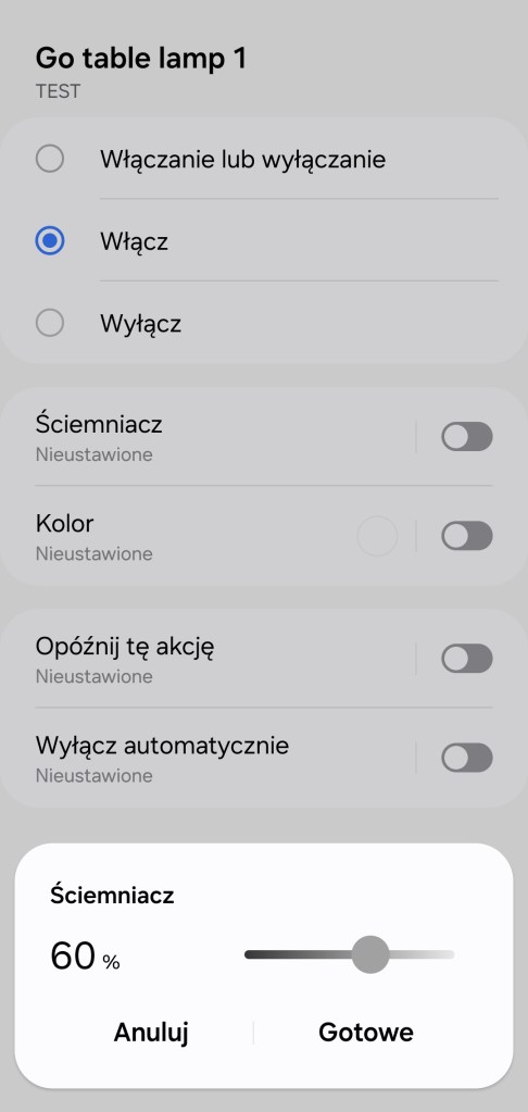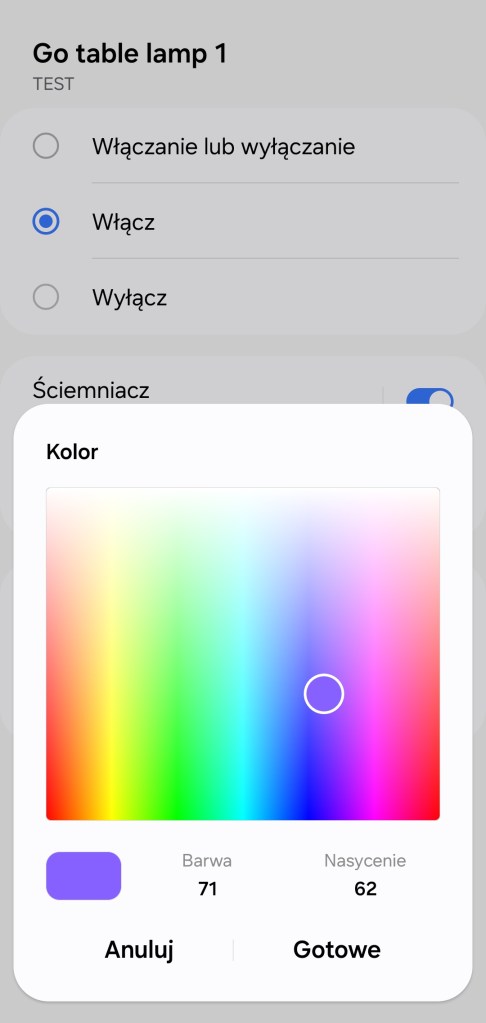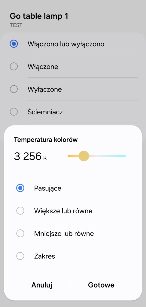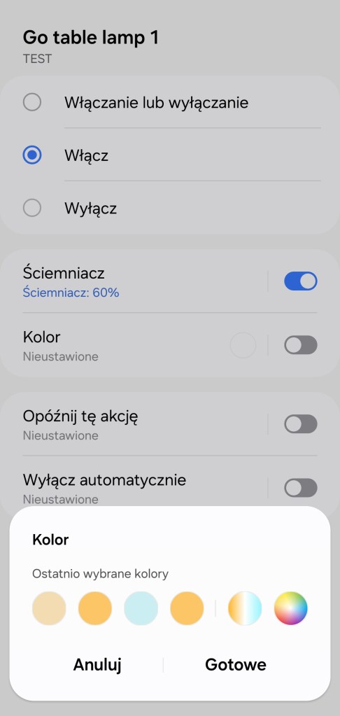 W drugiej możliwości „Wtedy” lampa pozwala odmienne aktywacje, mamy pełną kontrolę opcji przydatnych w tworzeniu np. scenerii. I tak mamy ponownie opcje „Włączono lub wyłączono” oraz „Włączone” i „Wyłączone”. Ustawienie jednego z 16 milionów kolorów i jasności lampy w zakresie 0 – 100%, dodatkowo możemy określić temperaturę barwową. Akcję uruchomienia światła możemy opóźnić o dowolny czas, jak i wyłączyć ją automatycznie po ustalonym czasie. Jak możecie zauważyć na screenach przy ustalaniu kelwinów skala jest źle dopasowana.