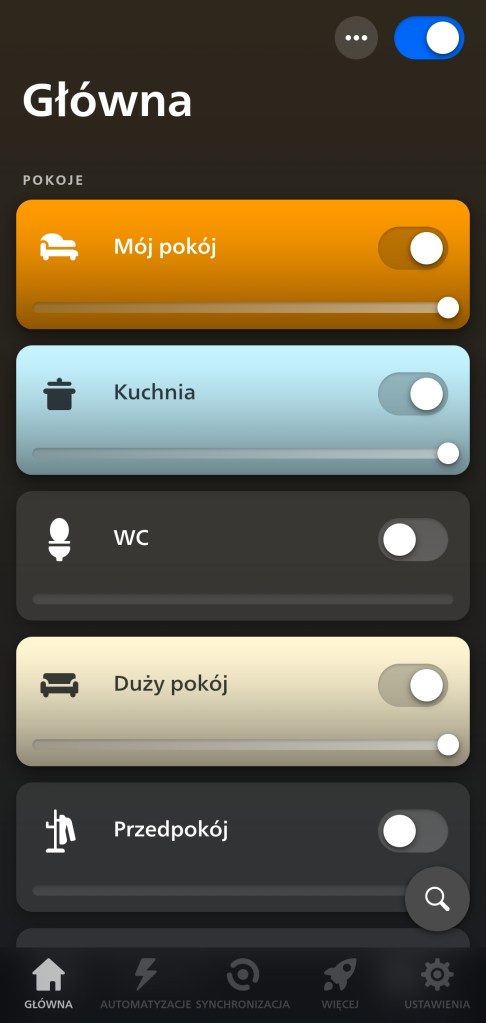 W głównym panelu sterowania urządzeniem mamy możliwość włączenia/wyłączenia lampy Philips Hue. Interfejs się trochę zmienił, więc poniżej znajduje się belka umożliwiająca ustawienie wartości ściemniacza od 1 do 100%. Następnie mamy do wyboru jedną z opcji oświetlenia okołodobowego: drzemka, relaks, czytanie i energiczny. Niżej jest możliwość ustawienia dowolnego koloru z palety barw RGB lub temperatury barwowej ciepłej-zimnej, aby to zrobić należy jedno z dwóch kwadratów kliknąć. Mamy możliwość ustawienia jednego z 16 milionów kolorów oraz ustawienie temperatury światła w zakresie 2000 K – 6500 K. Obok znajdują się cztery kwadraty ostatnio używanych kolorów. Ostatnią opcją jest ustawienie minutnika. Na dole znajdziemy sekcję panelu „Procedury” znajdziemy tutaj szybkie procedury: włączenia i wyłączenia urządzenia o danej porze dnia oraz listę procedur gdzie używana jest lampa stołowa. Panel „Historii” nie różni się znacznie od innych urządzeń, mamy dostęp do sortowania i przestudiowania historii działań oświetlenia. W ustawieniach „Edytuj” mamy standardową możliwość zmiany nazwy, ikony i pokoju.