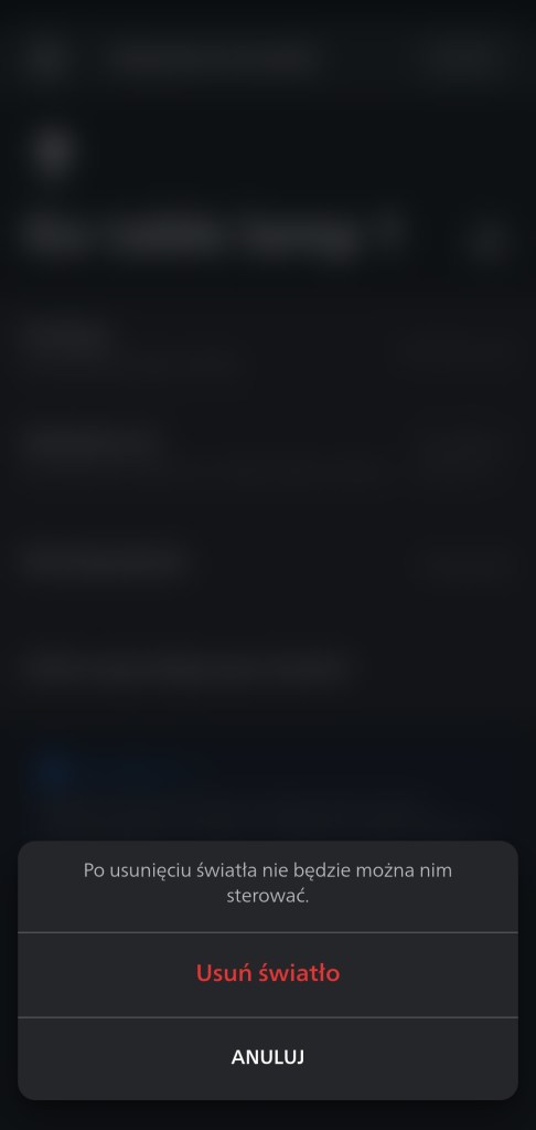 Aby uniknąć ponownego wyszukania urządzenia przez aplikację SmartThings, należy również usunąć lampę z aplikacji Philips Hue. W tym celu otwieramy aplikację Hue, przechodzimy do Ustawienia (prawy dolny róg). Następnie z dostępnych opcji wybierz Światła. Na liście świateł Hue wyszukujemy lampę GO, aby upewnić się, że usuwamy odpowiednią lampę, możemy kliknąć nazwę, a lampa mrugnie nam światłem. Aby usunąć, wybieramy Usuń i potwierdzamy, klikając ponownie Usuń światło.