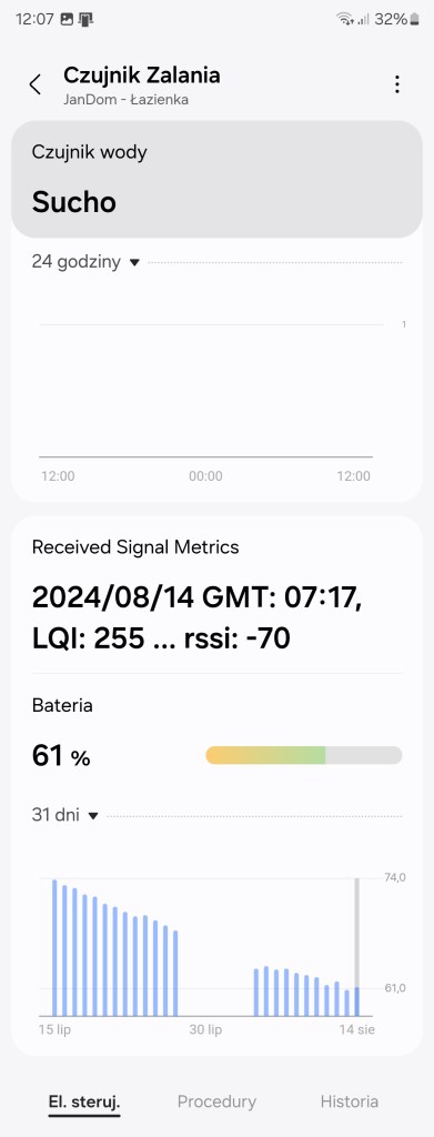 W aplikacji SmartThings możemy zobaczyć stan czujnika, informacje dotyczące sygnału oraz poziom baterii. W swoim sensorze zastosowałem akumulatorek o pojemności 800 mAh i po 6 miesiącach nadal pokazuje 60% baterii.