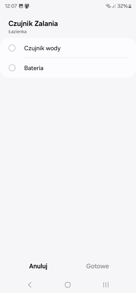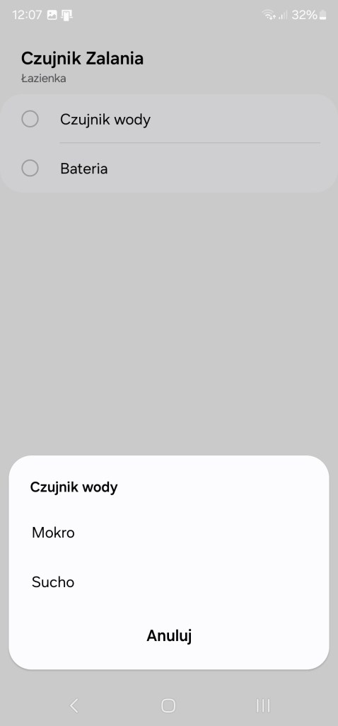 Czujnik łączymy z centralą SmartThings przez sterownik Edge Zigbee Moisture Sensor Mc. Link do kanału ( https://api.smartthings.com/invitation-web/accept?id=6b68563b-1905-4654-8d2b-e677a2997424 ) autorstwa Mariano Colmenarejo. W celu połączenia urządzenia należy odbezpieczyć obudowę, otworzyć pokrywę baterii i przycisnąć przycisk parowania przez kilka sekund do czasu usłyszenia sygnału. Poziom baterii i dane sygnału powinny się pojawić maksymalnie do 24 godzin od sparowania. W celu przetestowania sensora należy umieścić czujnik w misce wody tak, aby dolne piny dotykały powierzchni wody. Połączenie pinów przez ciecz powoduje zamknięcie obwodu elektrycznego, co uruchamia alarm. Czujnik nie jest w pełni wodoodporny, więc nie możemy go zanurzyć całkowicie w wodzie. Alarm oczywiście wyciszy się po osuszeniu styków na spodzie urządzenia.