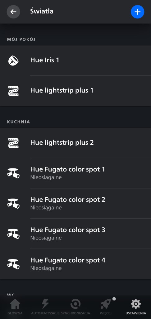 Jeśli posiadamy mostek Hue i centralę SmartThings możemy przejść do tradycyjnej instalacji. W pierwszej kolejności musimy połączyć nową lampę LED z mostkiem i aplikacją Philips Hue. W tym celu musimy pobrać aplikację z Google Store (Android 10 lub nowszy), bądź AppStore (iOS 16 lub nowszy). Po zainstalowaniu aplikacji uruchamiamy ją. Aby wyszukać nowe urządzenia, musimy przejść do Ustawienia aplikacji, klikamy w prawym dolny róg ekranu. Z dostępnych opcji, kliknij Światła, następnie plus ( + ) znajdujący się w prawym górnym rogu. Należy upewnić się, że lampa podłączona jest do zasilania. Możemy ją dodać poprzez wpisanie numeru seryjnego (znajduje się on na spodzie lampy) lub poprzez wyszukanie. Wybraliśmy drugą opcję, klikamy Wyszukaj. Po chwili zostanie wykryta, nadajemy jej nazwę lub pozostawiamy domyślną i zatwierdzamy, klikając Zapisz. Następnie umieszczamy w pokoju, w tym celu przeciągamy ją do wybranego. Kończymy proces instalacji, wybierając Gotowe. Na ekranie pojawi się komunikat o prawidłowym dodaniu lampy sufitowej.