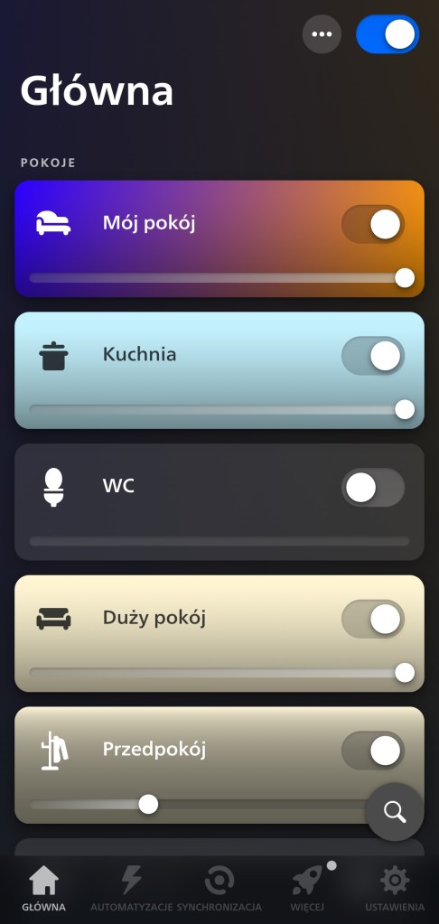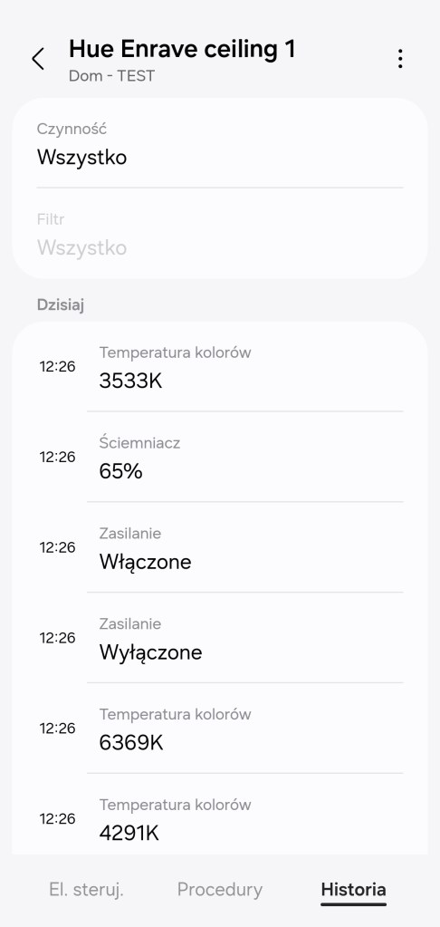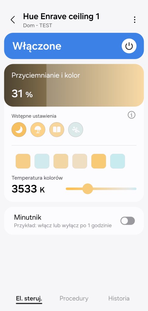 W głównym panelu sterowania urządzeniem mamy możliwość włączenia/wyłączenia lampy Philips Hue. Interfejs się trochę zmienił, więc poniżej znajduje się belka umożliwiająca ustawienie wartości ściemniacza od 1 do 100%. Następnie mamy do wyboru jedną z opcji oświetlenia okołodobowego: drzemka, relaks, czytanie i energiczny. Niżej jest możliwość ustawienia temperatury barwowej ciepłej 2000 K – zimnej 6500 K, aby to zrobić należy jedno z dwóch kwadratów kliknąć. Obok znajdują się cztery kwadraty ostatnio używanych odcieni barwy światła. Ostatnią opcją jest ustawienie minutnika. Na dole znajdziemy sekcję panelu „Procedury” znajdziemy tutaj szybkie procedury: włączenia i wyłączenia urządzenia o danej porze dnia oraz listę procedur gdzie używana jest lampa sufitowa. Panel „Historii” nie różni się znacznie od innych urządzeń, mamy dostęp do sortowania i przestudiowania historii działań oświetlenia. W ustawieniach „Edytuj” mamy standardową możliwość zmiany nazwy, ikony i pokoju.