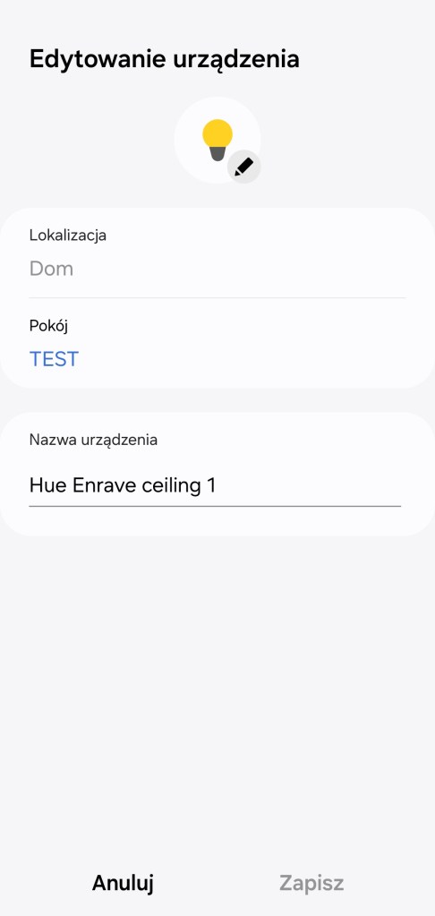 Aby uniknąć ponownego wyszukania urządzenia przez aplikację SmartThings, należy również usunąć lampę z aplikacji Philips Hue. W tym celu otwieramy aplikację Hue, przechodzimy do Ustawienia (prawy dolny róg). Następnie z dostępnych opcji wybierz Światła. Na liście świateł Hue wyszukujemy lampę Enrave, aby upewnić się, że usuwamy odpowiednią lampę, możemy kliknąć nazwę, a lampa mrugnie nam światłem. Aby usunąć, wybieramy Usuń i potwierdzamy, klikając ponownie Usuń światło.