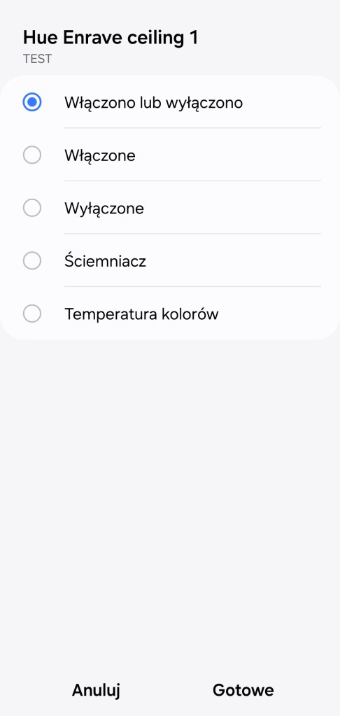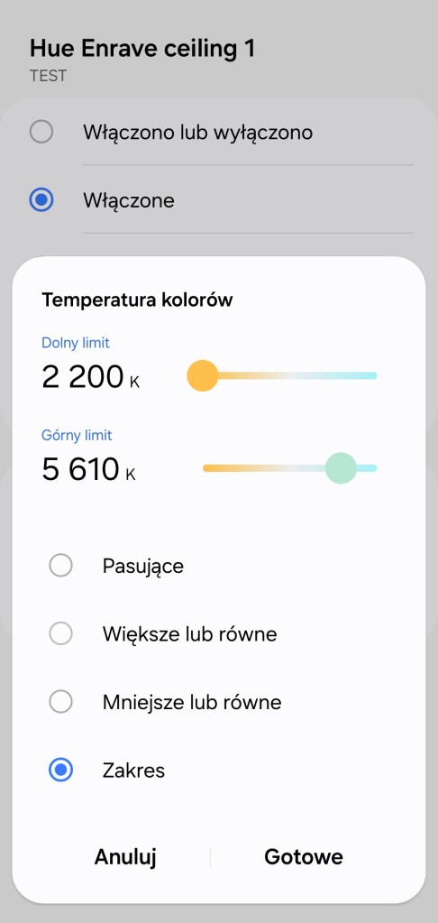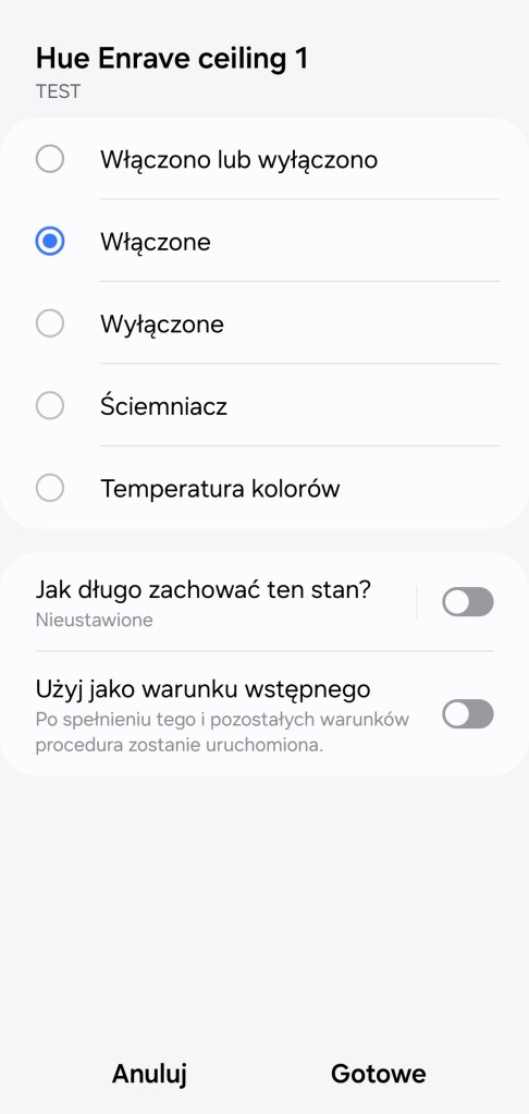 Tworzenie procedur (dawniej automatyzacje) „Jeśli … to Wtedy” musimy podzielić na dwa etapy, ponieważ znacznie różnią się dostępne opcje. W pierwszej możliwości „Jeśli” urządzenie pozwala na wybranie opcji „Włączono lub wyłączono”, czyli zmiana stanu, bądź „Włączone” i „Wyłączone”. Poniżej mamy wartość ściemniacza 1 – 100% i temperatury kolorów z zakresu 2000 – 6500 K. Możemy ustawić również zakres tych wartości. Dodatkowo mamy opcję, jak długo zachowany powinien być stan przed uruchomieniem procedury oraz, czy ma być to warunek wstępny.