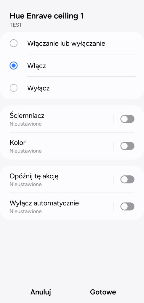 W drugiej możliwości „Wtedy” lampa pozwala odmienne aktywacje, mamy pełną kontrolę opcji przydatnych w tworzeniu np. scenerii. I tak mamy ponownie opcje „Włączono lub wyłączono” oraz „Włączone” i „Wyłączone”. Ustawienie jasności lampy w zakresie 0 – 100%, dodatkowo możemy określić temperaturę barwową. Akcję uruchomienia światła możemy opóźnić o dowolny czas, jak i wyłączyć ją automatycznie po ustalonym czasie. Jak możecie zauważyć na screenach przy ustalaniu kelwinów skala jest źle dopasowana.