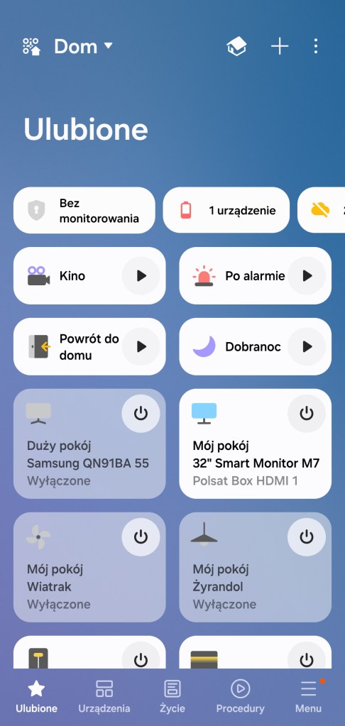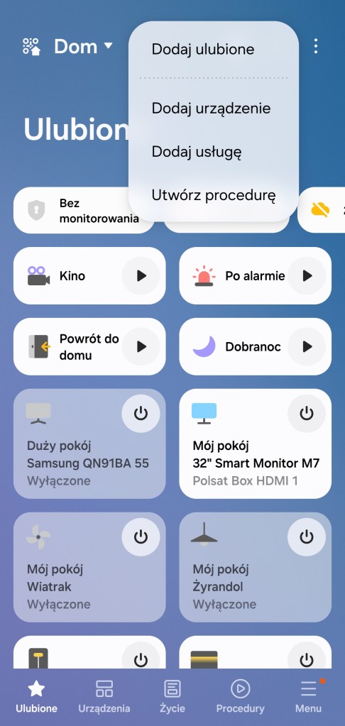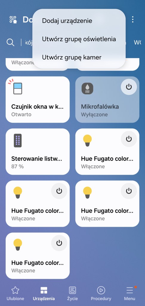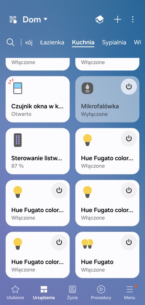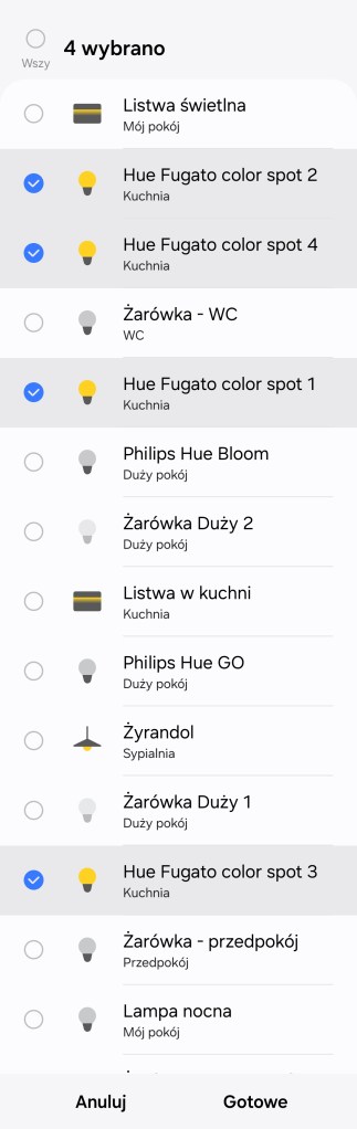 Aby ułatwić sterowanie całym żyrandolem Fugato, a nie pojedynczymi żarówkami. Skorzystałem z grupowania oświetlenia w aplikacji SmartThings. Tym samym na jedym pulpicie sterującym kontroluje wszystkie cztery punkty świetlne. Ułatwia to również tworzenie procedur. Opcje na panelu sterowania są identyczne, jak w przypadku pojedynczych reflektorów. Mamy dodaktowe opcje, jak oświetlenie okołodobowe, czy sen.