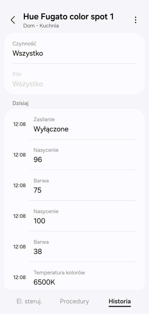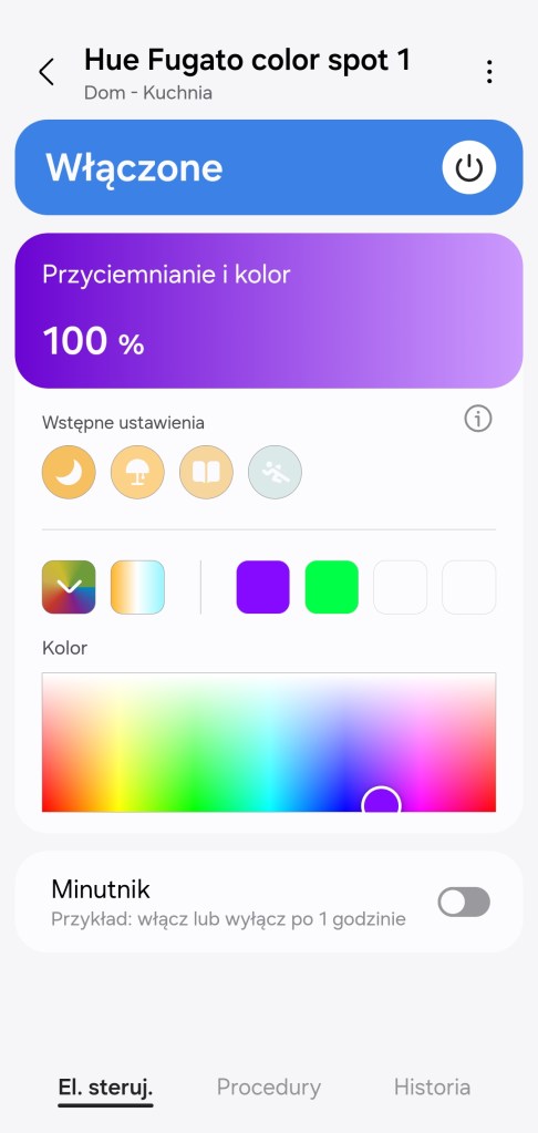 W głównym panelu sterowania urządzeniem mamy możliwość włączenia/wyłączenia lampy Philips Hue. Interfejs się trochę zmienił, więc poniżej znajduje się belka umożliwiająca ustawienie wartości ściemniacza od 1 do 100%. Następnie mamy do wyboru jedną z opcji oświetlenia okołodobowego: drzemka, relaks, czytanie i energiczny. Niżej jest możliwość ustawienia dowolnego koloru z palety barw RGB lub temperatury barwowej ciepłej-zimnej, aby to zrobić należy jedno z dwóch kwadratów kliknąć. Mamy możliwość ustawienia jednego z 16 milionów kolorów oraz ustawienie temperatury światła w zakresie 2000 K – 6500 K. Obok znajdują się cztery kwadraty ostatnio używanych kolorów. Ostatnią opcją jest ustawienie minutnika. Na dole znajdziemy sekcję panelu „Procedury” znajdziemy tutaj szybkie procedury: włączenia i wyłączenia urządzenia o danej porze dnia oraz listę procedur gdzie używana jest lampa sufitowej. Panel „Historii” nie różni się znacznie od innych urządzeń, mamy dostęp do sortowania i przestudiowania historii działań oświetlenia. W ustawieniach „Edytuj” mamy standardową możliwość zmiany nazwy, ikony i pokoju.