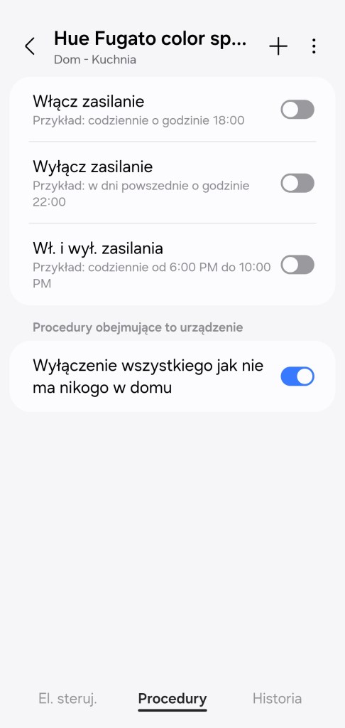 Aby usunąć lampę z ekosystemu SmartThings, należy wejść w główny ekran urządzenia. Kliknąć Więcej opcji ( ⋮ ) w prawym górnym rogu ekranu, i wybrać Usuń urządzenie. Następnie potwierdzamy operację, stukając Usuń. Pamiętaj, że usunięcie z aplikacji skutkuje również wyczyszczeniem urządzenia z wszelkich przypisanych procedur i scenerii. Operację musimy powtarzać dla każdego z reflektorów.