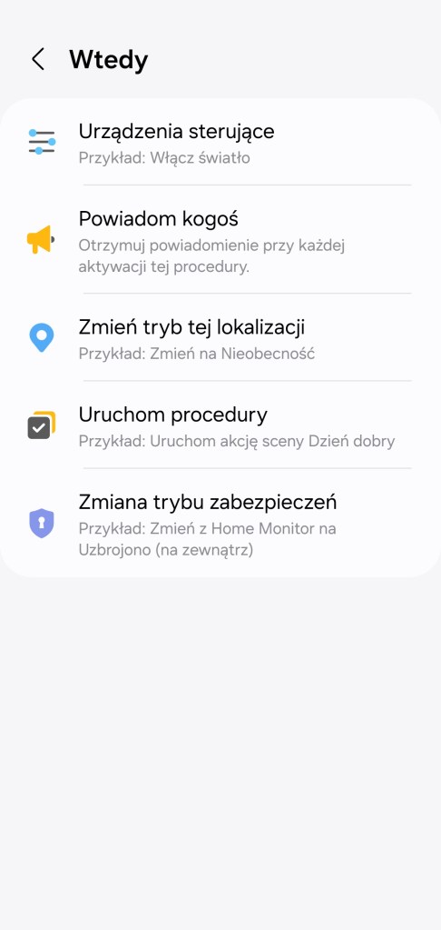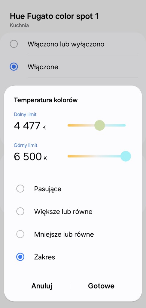 Tworzenie procedur (dawniej automatyzacje) „Jeśli … to Wtedy” musimy podzielić na dwa etapy, ponieważ znacznie różnią się dostępne opcje. W pierwszej możliwości „Jeśli” urządzenie pozwala na wybranie opcji „Włączono lub wyłączono”, czyli zmiana stanu, bądź „Włączone” i „Wyłączone”. Poniżej mamy wartość ściemniacza 1 – 100% i temperatury kolorów z zakresu 2000 – 6500 K. Możemy ustawić również zakres tych wartości. Dodatkowo mamy opcję, jak długo zachowany powinien być stan przed uruchomieniem procedury oraz, czy ma być to warunek wstępny.