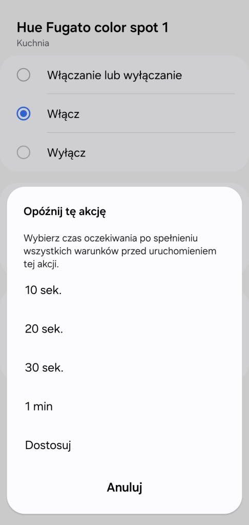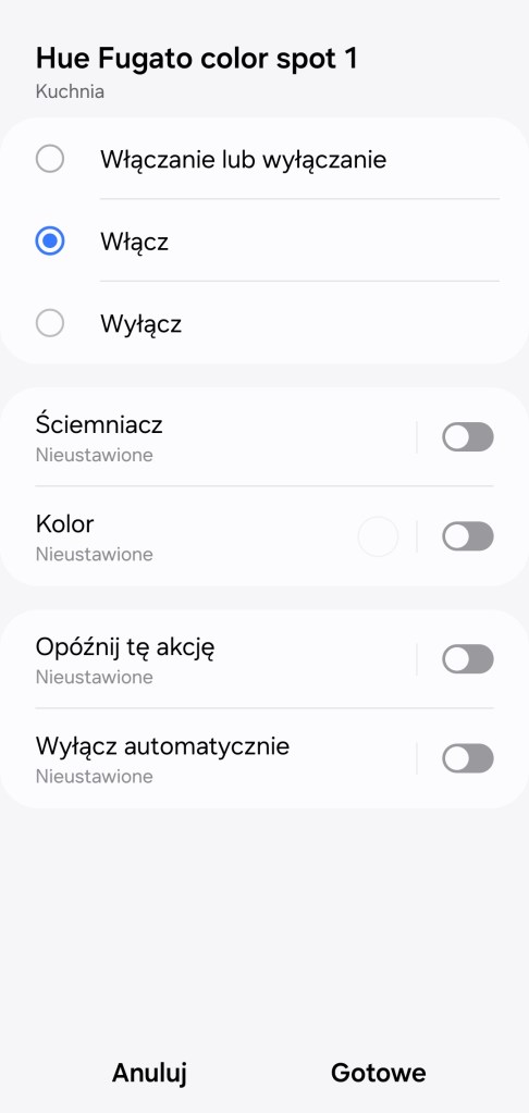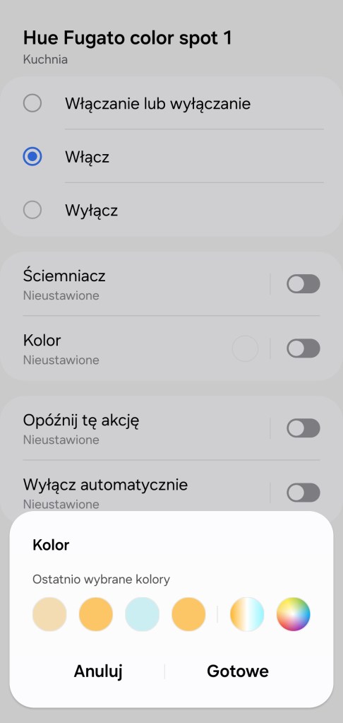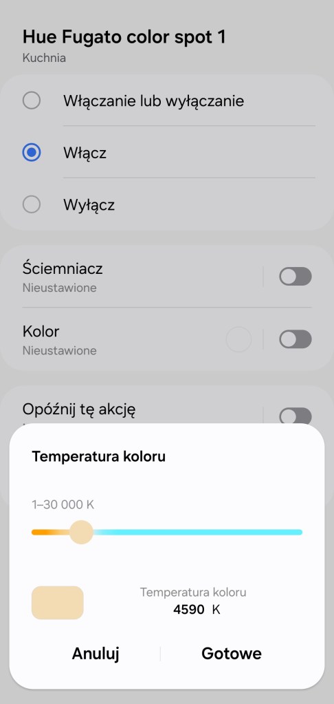 W drugiej możliwości „Wtedy” lampa pozwala odmienne aktywacje, mamy pełną kontrolę opcji przydatnych w tworzeniu np. scenerii. I tak mamy ponownie opcje „Włączono lub wyłączono” oraz „Włączone” i „Wyłączone”. Ustawienie jednego z 16 milionów kolorów i jasności lampy w zakresie 0 – 100%, dodatkowo możemy określić temperaturę barwową. Akcję uruchomienia światła możemy opóźnić o dowolny czas, jak i wyłączyć ją automatycznie po ustalonym czasie. Jak możecie zauważyć na screenach przy ustalaniu kelwinów skala jest źle dopasowana.