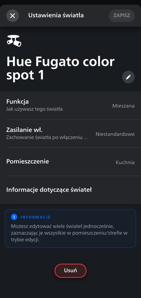 Aby uniknąć ponownego wyszukania urządzenia przez aplikację SmartThings, należy również usunąć lampę z aplikacji Philips Hue. W tym celu otwieramy aplikację Hue, przechodzimy do Ustawienia (prawy dolny róg). Następnie z dostępnych opcji wybierz Światła. Na liście świateł Hue wyszukujemy lampę Fugato, aby upewnić się, że usuwamy odpowiednią lampę, możemy kliknąć nazwę, a lampa mrugnie nam światłem. Aby usunąć, wybieramy Usuń i potwierdzamy, klikając ponownie Usuń światło. Instrukcję musimy powtarzać dla każdego z reflektorów.