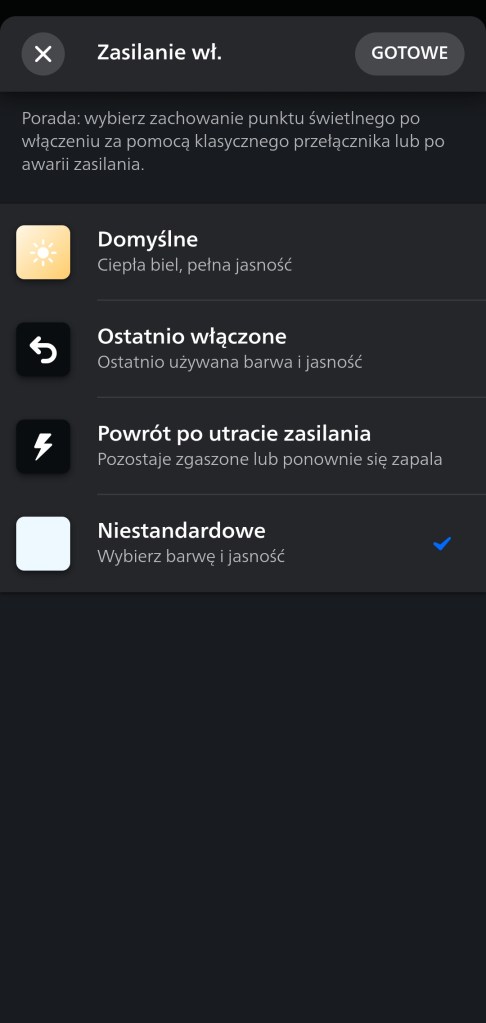 Standardowo, jak w przypadku innych urządzeń Philips Hue, w ustawieniach możemy wybrać zachowanie po włączeniu zasilania, mamy do dyspozycji opcje: domyślne, ostatnio używana barwa i jasność, pozostawienie zgaszonego światła oraz niestandardowe.